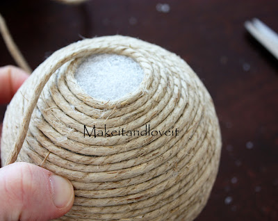 Then added more glue as I went, and winded more and more cord, flush against the ball. (Place your glue right on the styrofoam ball, up against the edge of the cording.)