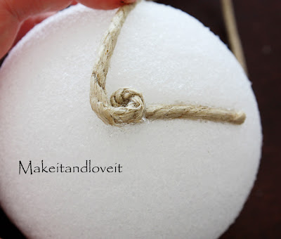 I found some thick hemp cording at Wal-Mart in the craft section……or maybe it was with the jewelry supplies. I also found 4 inch styrofoam balls there as well.