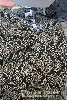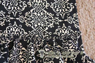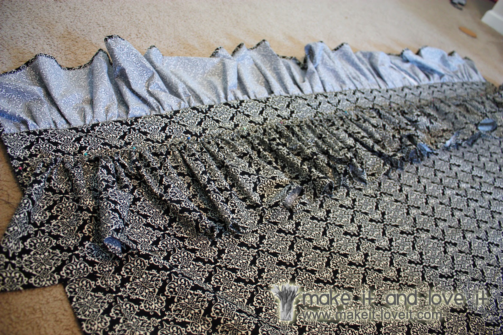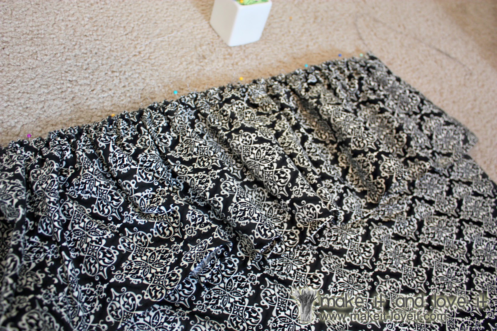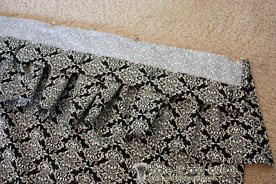 Then start pulling and gathering the ruffle piece until it is as wide as the shower curtain piece. (Need help gathering? Check out this post