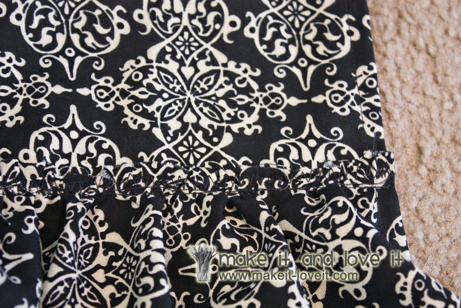 Then make a basting stitch along the top of both ruffle pieces, 1/4 inch from the unfinished top edge. And I actually made 2 basting stitches along the top of each ruffle. One from the left side to the center and the other from the center over to the right side. I did that so that I could make my gathers in two different sections on each piece.