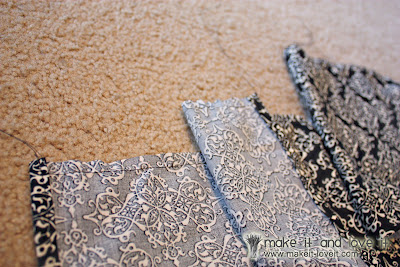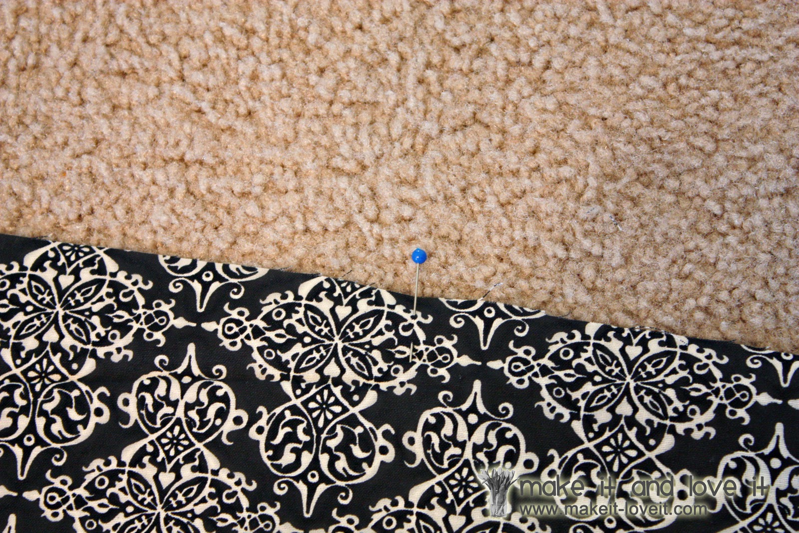 Then grab the piece with the button holes that you set aside, and lay it on top, upside down and face down. You want all of the raw unfinished edges to be lined up together. Pin all three layers together.