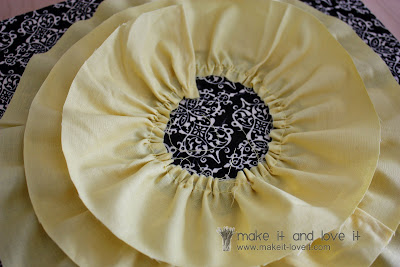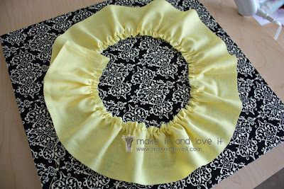 Then I made a basting stitch along one edge, about 1/4 inch away from the edge, to begin gathering the fabric. (Need help with gathering? Click