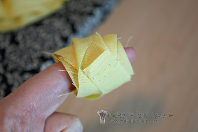 Then glue the gathered piece around in a circle, making each circle more and more narrow……moving towards the center of the flower.