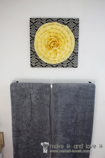 Then covered it with the same fabric as my shower curtain here. (It’s just plain ‘ol cotton…..but you could really use anything.)