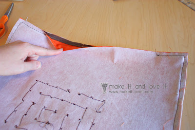 First, decide how big of a cover you’d like. My pillow size was 16 x 16 inches, so I cut out 2 pieces of orange cotton and 2 pieces of fusible interfacing that were all 17 x 17 inches. (If you use a sturdier fabric, you can skip the interfacing.)