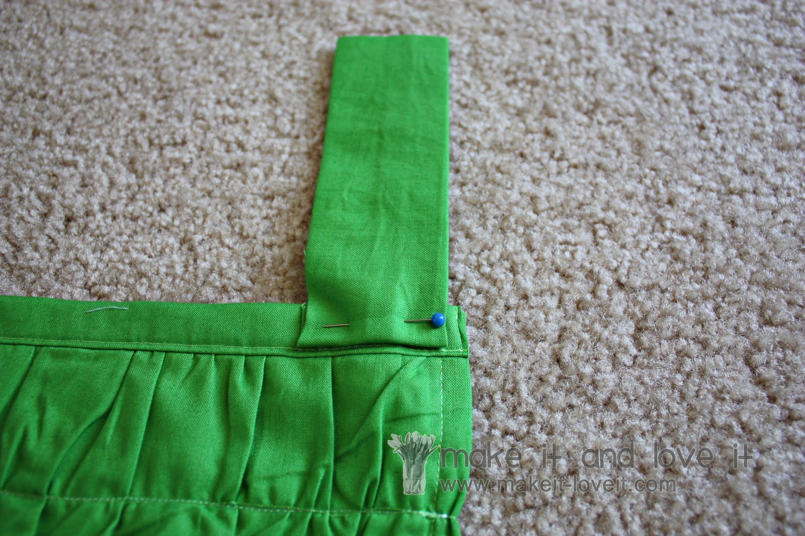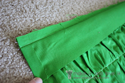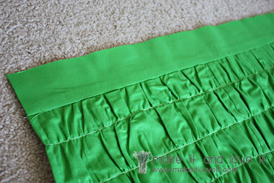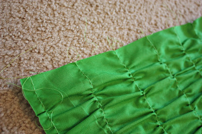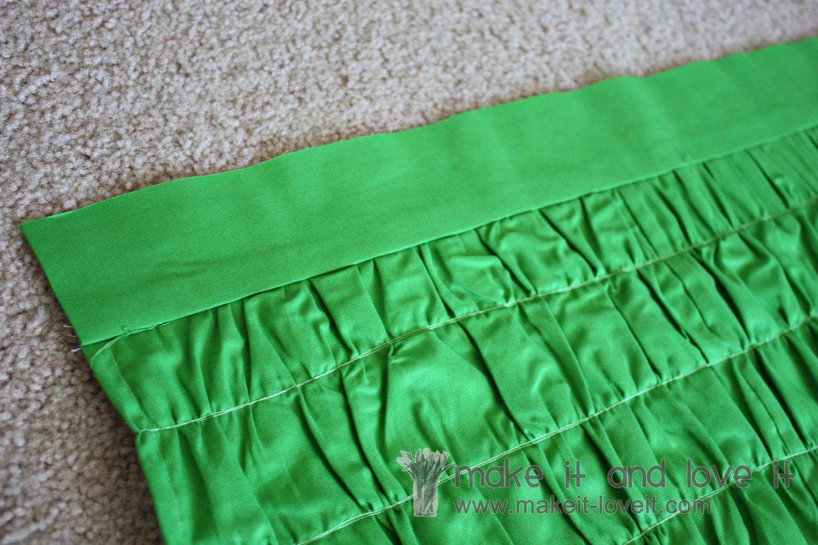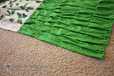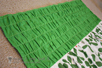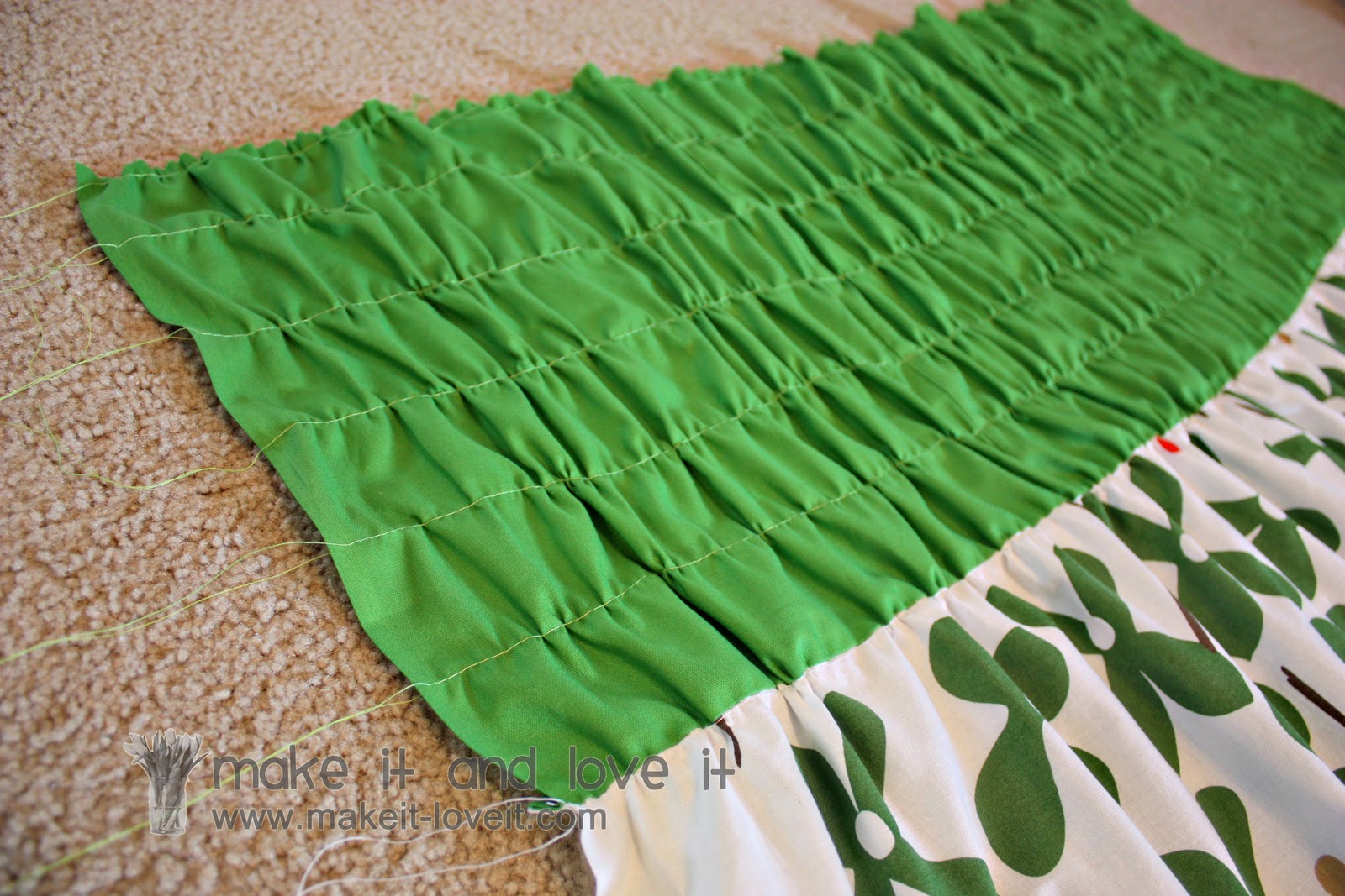 (I did this to eliminate the seam from puckering weird later on.) Then I pulled each top string and gathered up my fabric a bit……until the green section was about 40 inches wide.