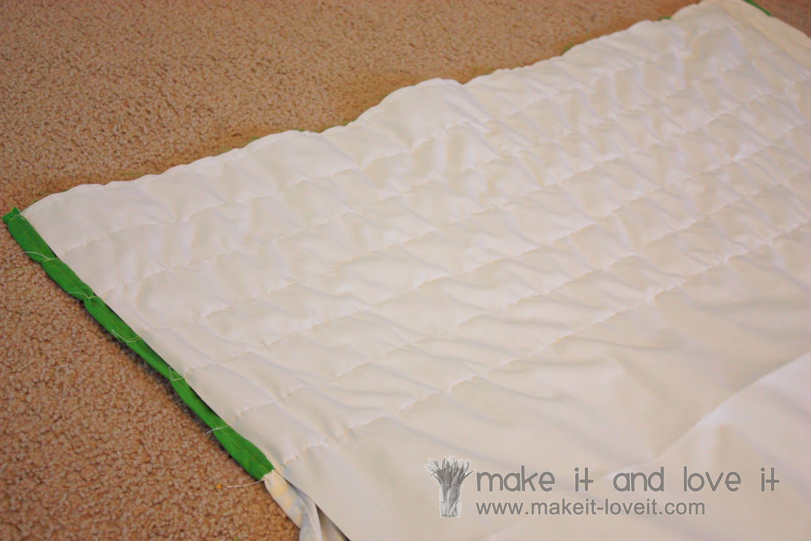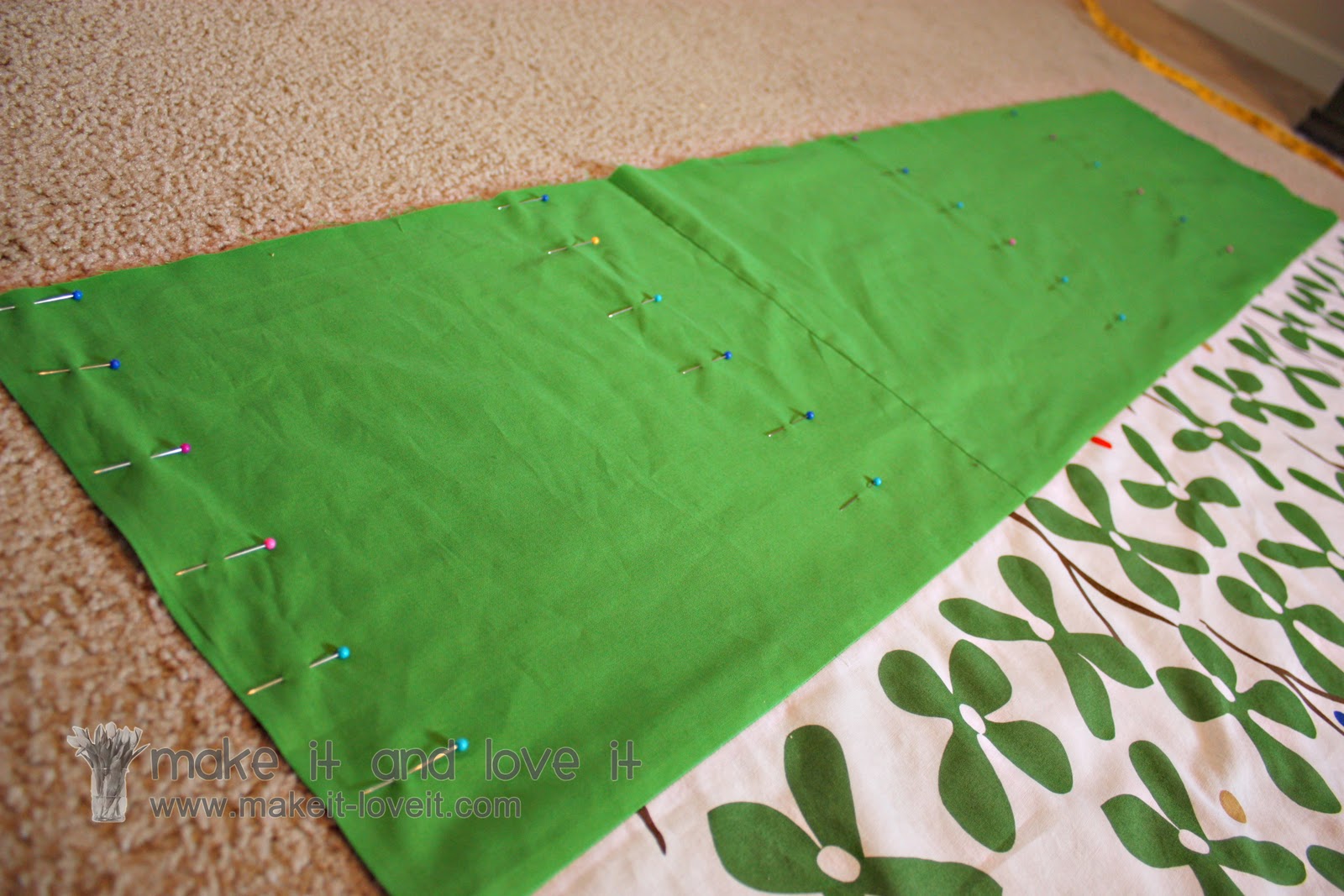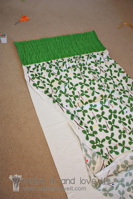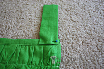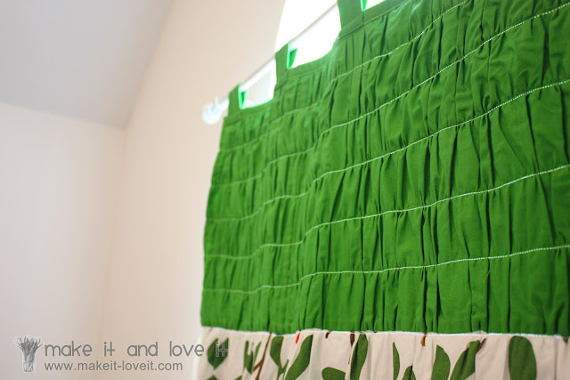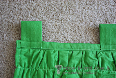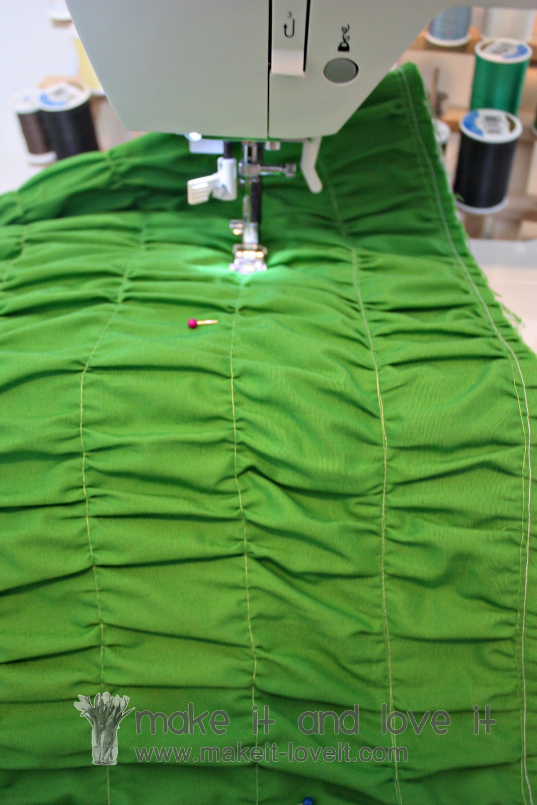(I did this to eliminate the seam from puckering weird later on.) Then I pulled each top string and gathered up my fabric a bit……until the green section was about 40 inches wide.
