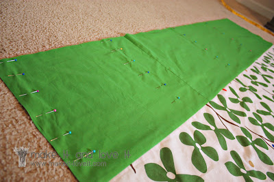 Then I made marks with pins that I would later use as a guide to make my gathers in this top section. I made my first row of pins about 1/2 an inch from the top…..then the next 6 rows about 2 inches apart until I reached the bottom of the green section. (You could also use chalk to draw your horizontal lines, if it’s hard to eyeball your pins as you’re sewing.)
