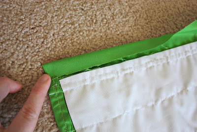 not back-stitch at either end. And the very bottom stitch was actually right below where the green and white fabric meet. And by that, I mean just right next to that seam, but on the lower side (white fabric) of the seam.