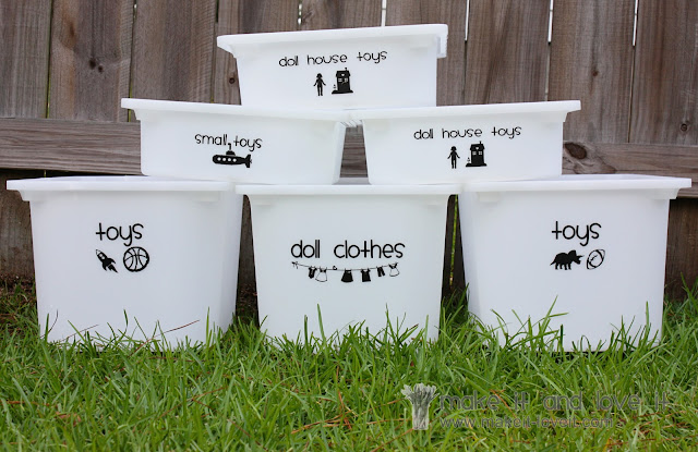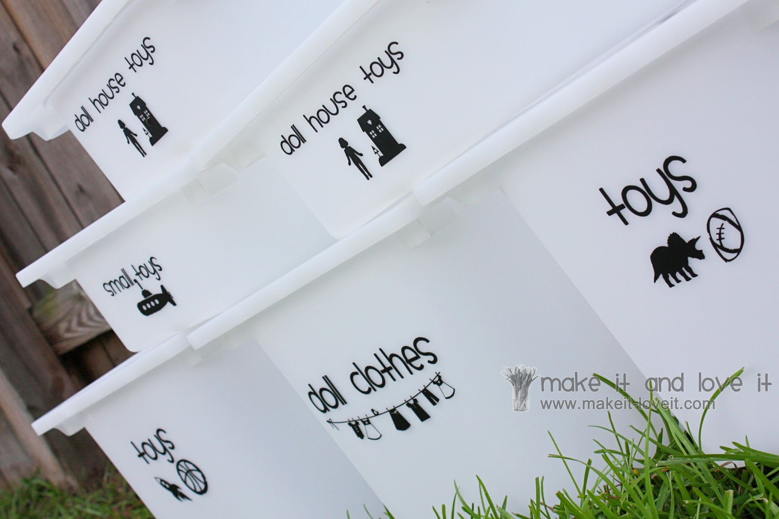 And don’t worry, if you don’t have a Silhouette or a craft cutter of some sort, you could always order vinyl lettering and then use stickers that correspond with the picture you need for each tub. Or cut out pictures and lettering from the computer and mod podge them on.