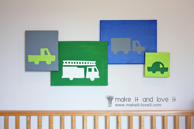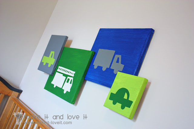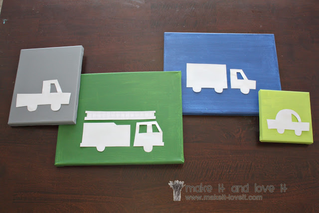 Then I cut out car shapes from paper, the size that I wanted them, and placed them on each canvas. (My shapes were printed off from my Silhouette program.)