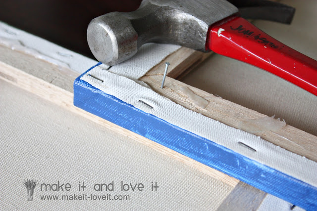 After all canvases were dry, I put the canvases back into the arrangement that I liked…….then one by one I nailed them together from the back. Using several nails for each canvas.
