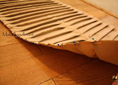 And then staple the fabric (with the pins still going down the center) to the wooden form, making sure to pull the edges tight, securing the folds in place. (Start on one of the sides and staple along the entire side. Then pull as you are stapling the other side. Then staple the shorter ends………but don’t pull to hard on the ends, or you will pull on the folds a bit.) Then take the pins out.