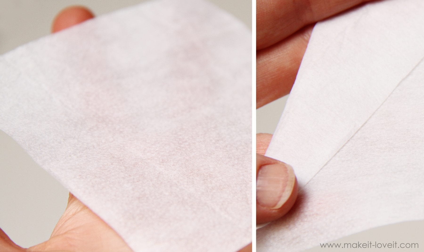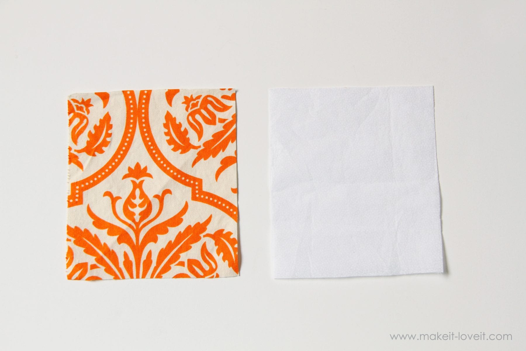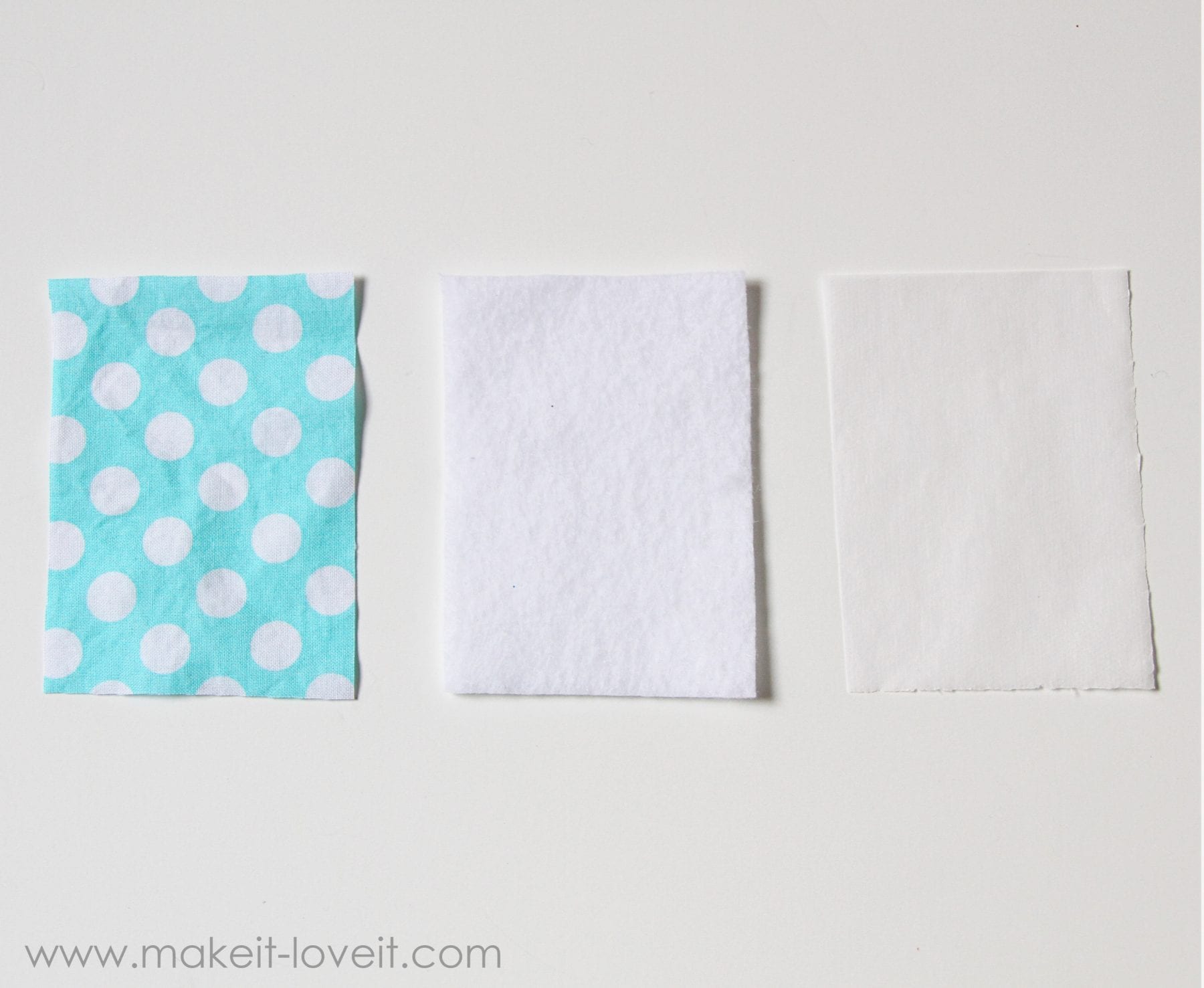 Now, let’s see how fusible web works. Cut out the shapes that you need to fuse together (the blue fabric on the left and the felt in the middle) and then cut a piece of fusible web the same size.