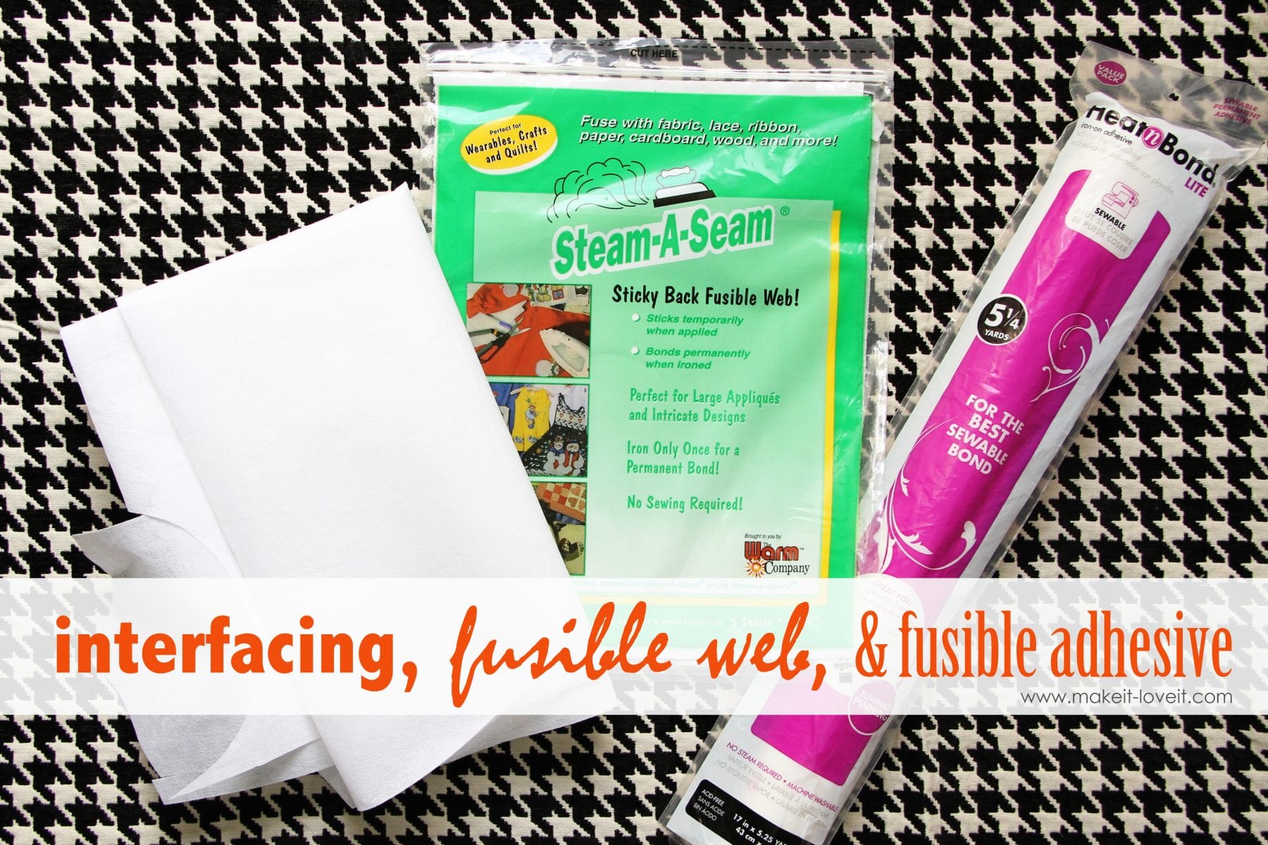 I use interfacing pretty often and always have a stock of it. But I also always have some fusible web and adhesive. And I use them all for different reasons. So I’ll explain all of that.
