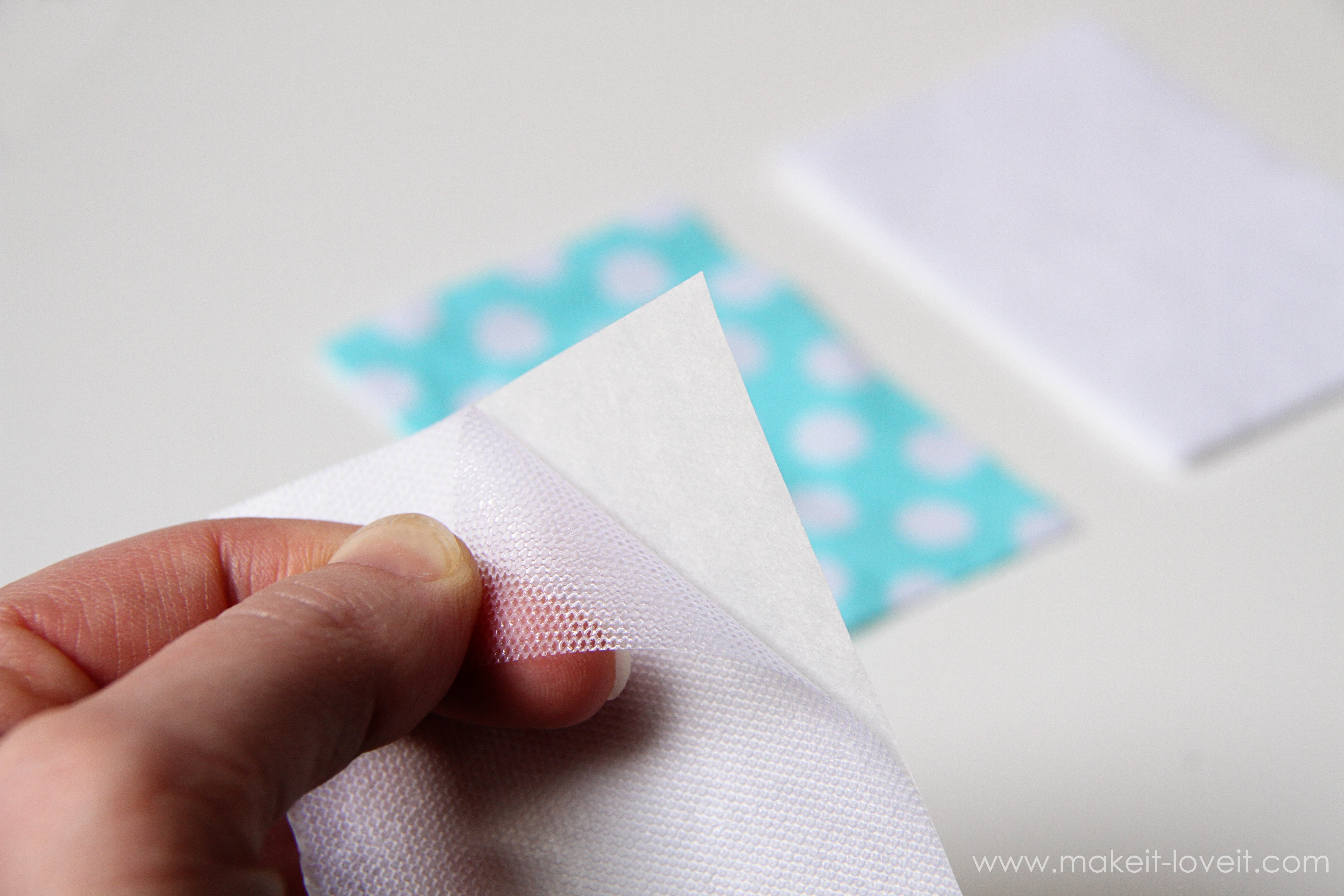 Then, peel the paper backing off………and the adhesive will stay adhered to the fabric. See how it’s shiny? That’s the adhesive. (If you peel off the paper and the adhesive didn’t stick to the fabric, you need to try ironing it on again.)