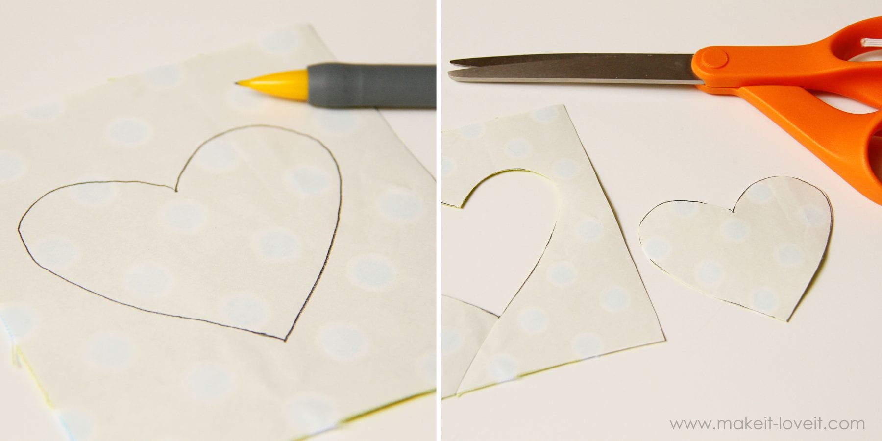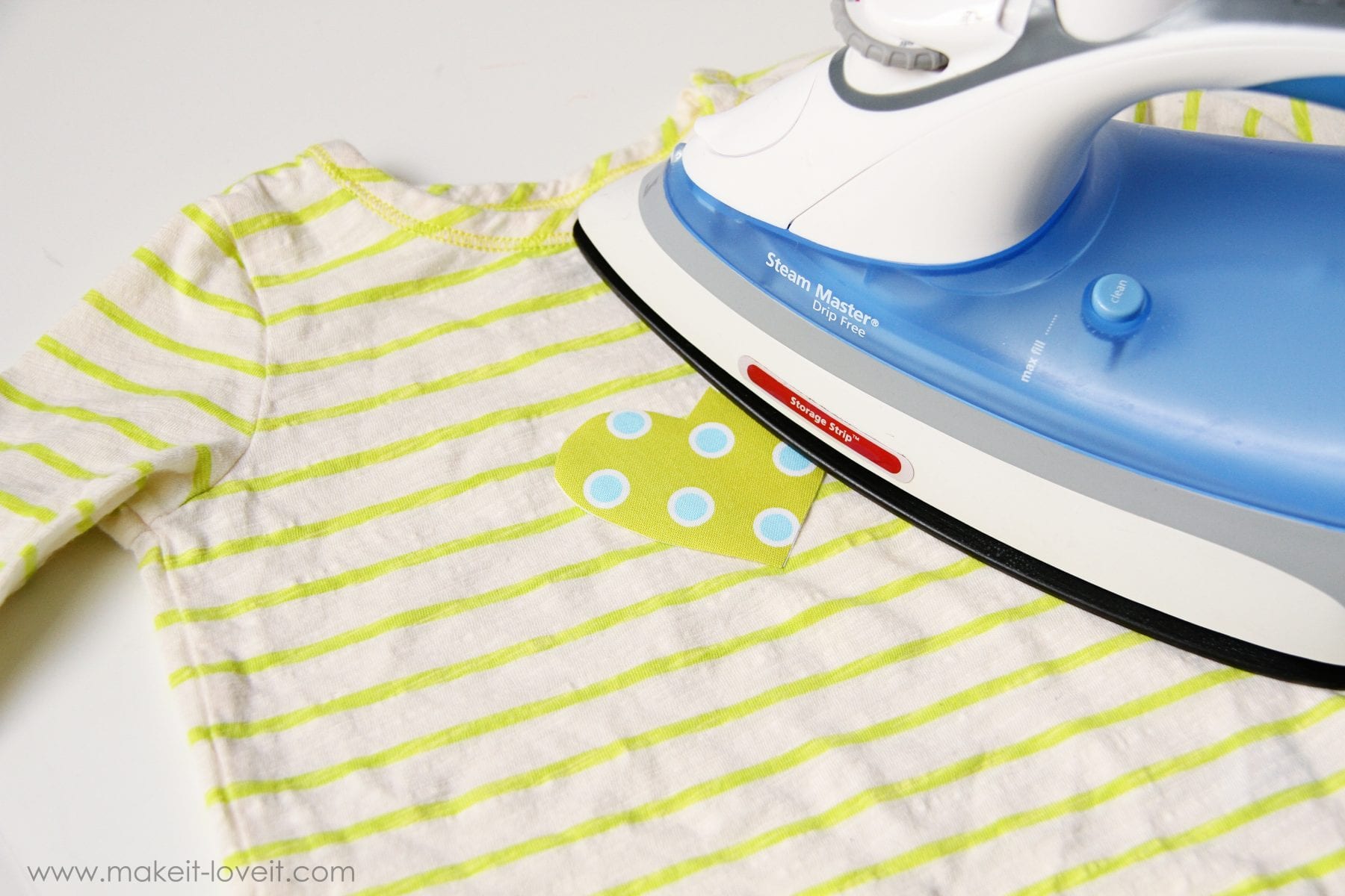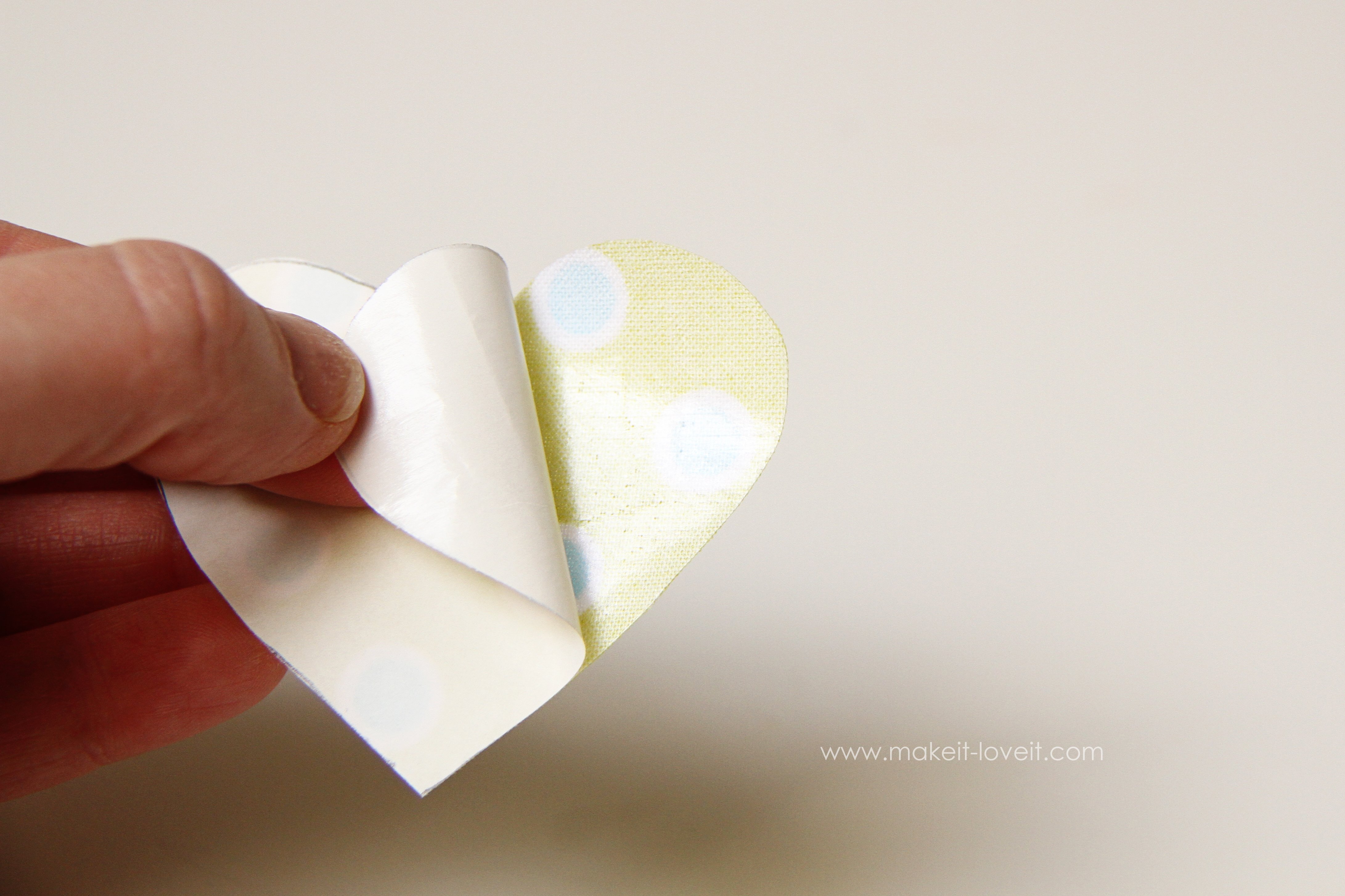 Now place the shiny side down on the fabric that you want to stick it to, and iron it down. (And as a side note, if you’re making an applique for clothing like this little heart below, you’ll then want to stitch around the edge of the heart, to secure it in place.)