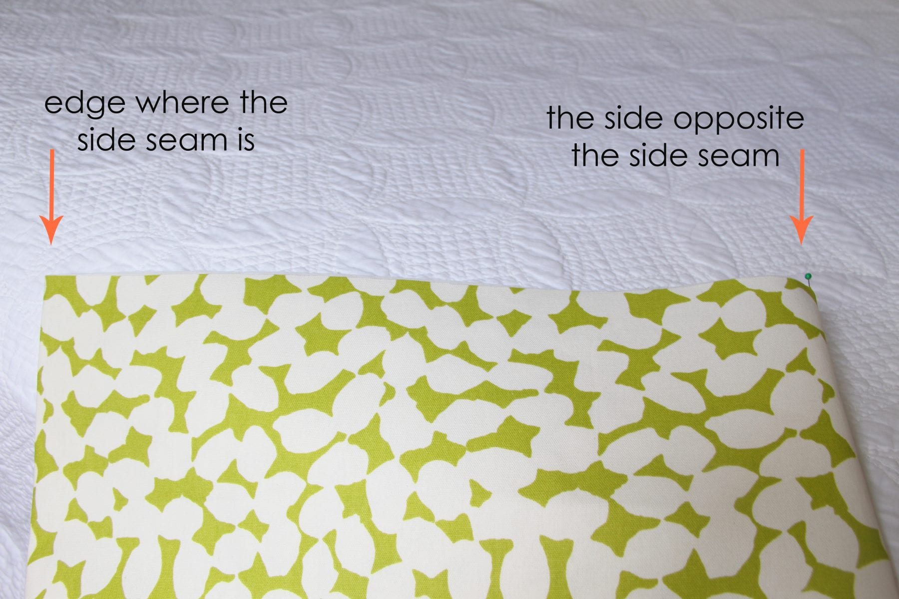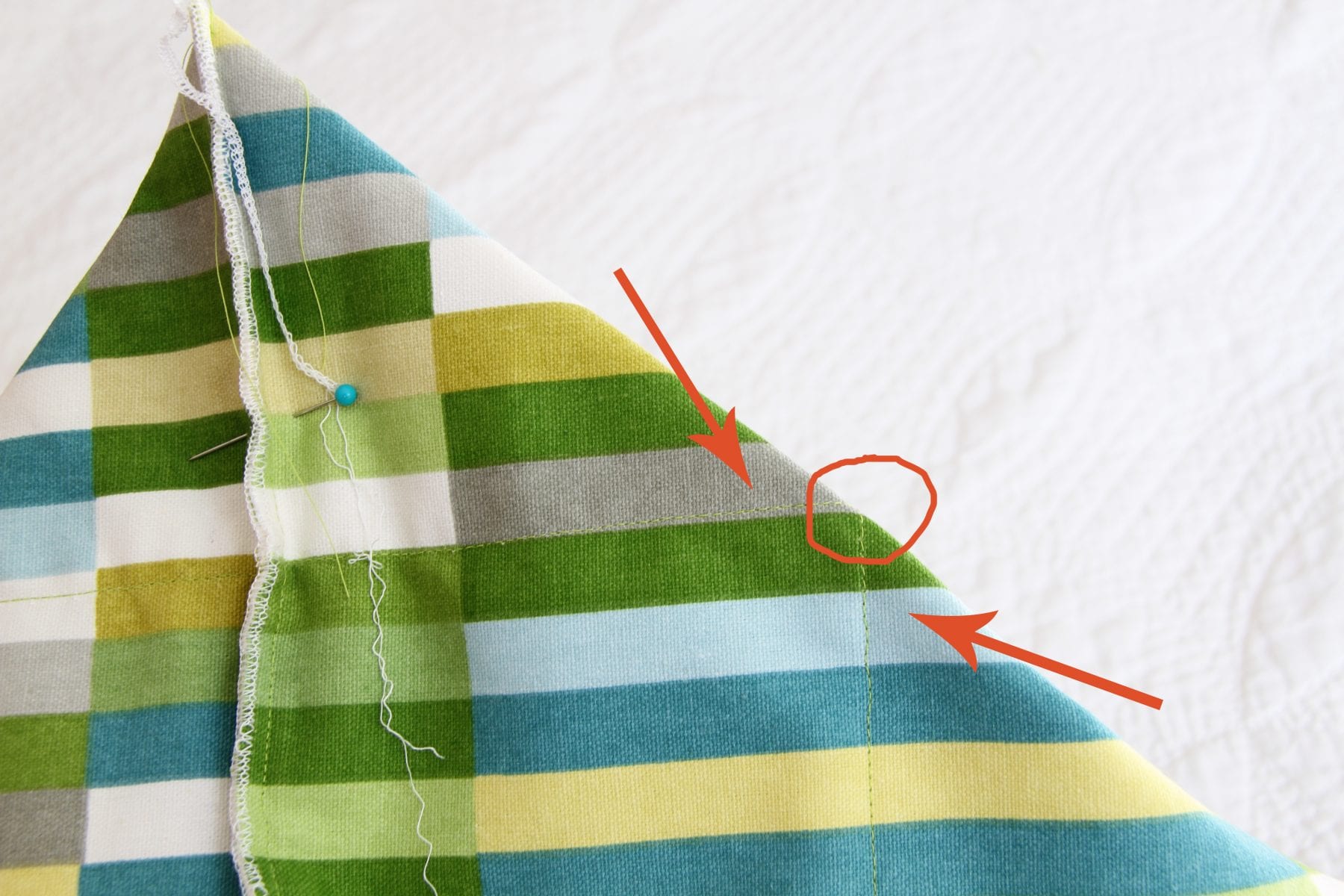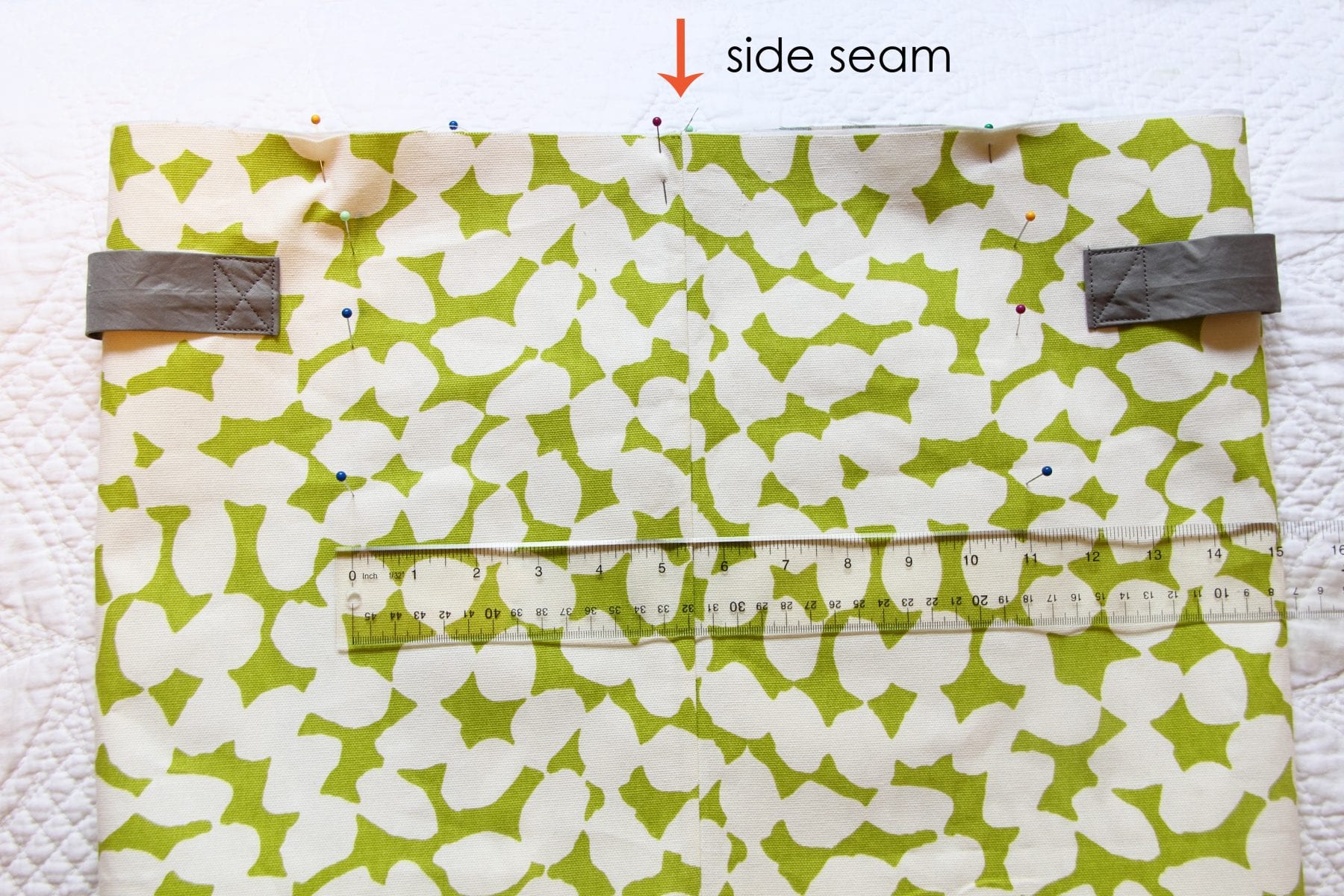 Now, look at the bottom corners.  Place a pin right at the side where that seam (that is 4 3/4 inch from the bottom) hits the side.