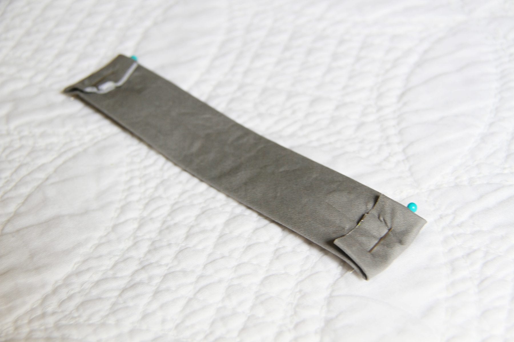 Then fold each end towards the back about 3/4 of an inch.  Pin in place.