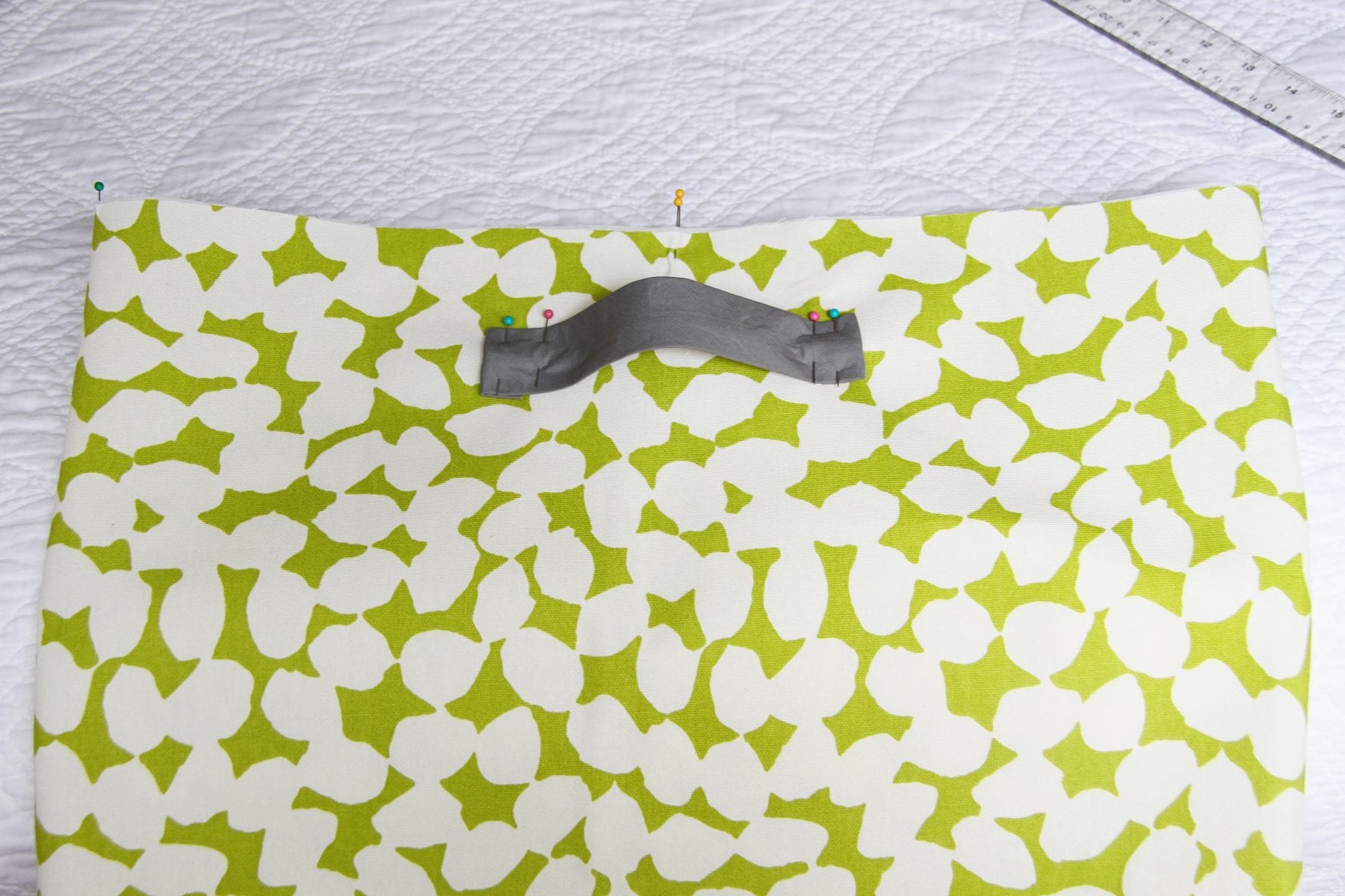 Then turn over and place the handle about 2 inches from the top upper edge, making sure to center the middle the handle right where the pin is at the top edge.  And to make the handle bubble out, place the two edges only 6 inches apart.