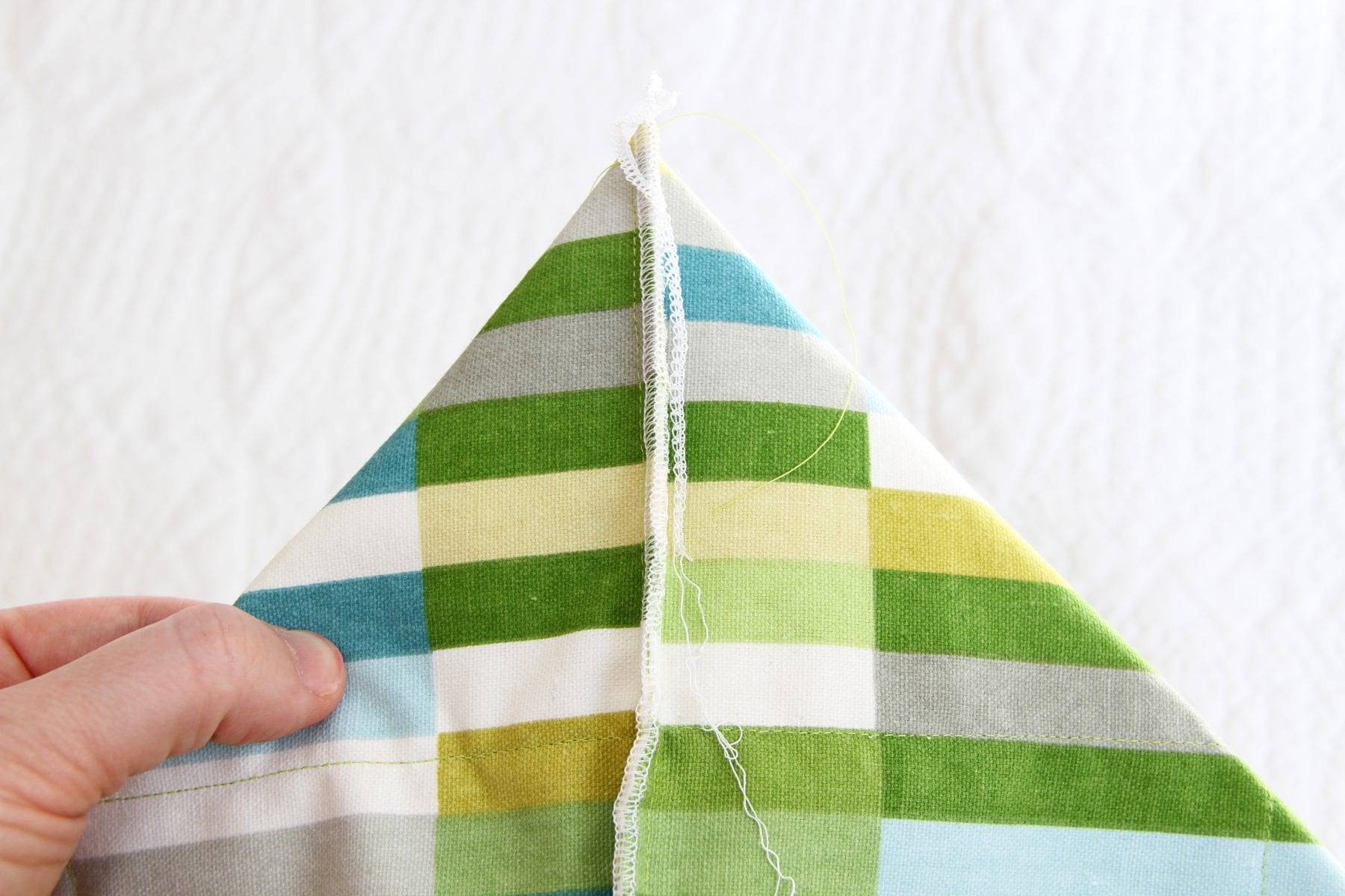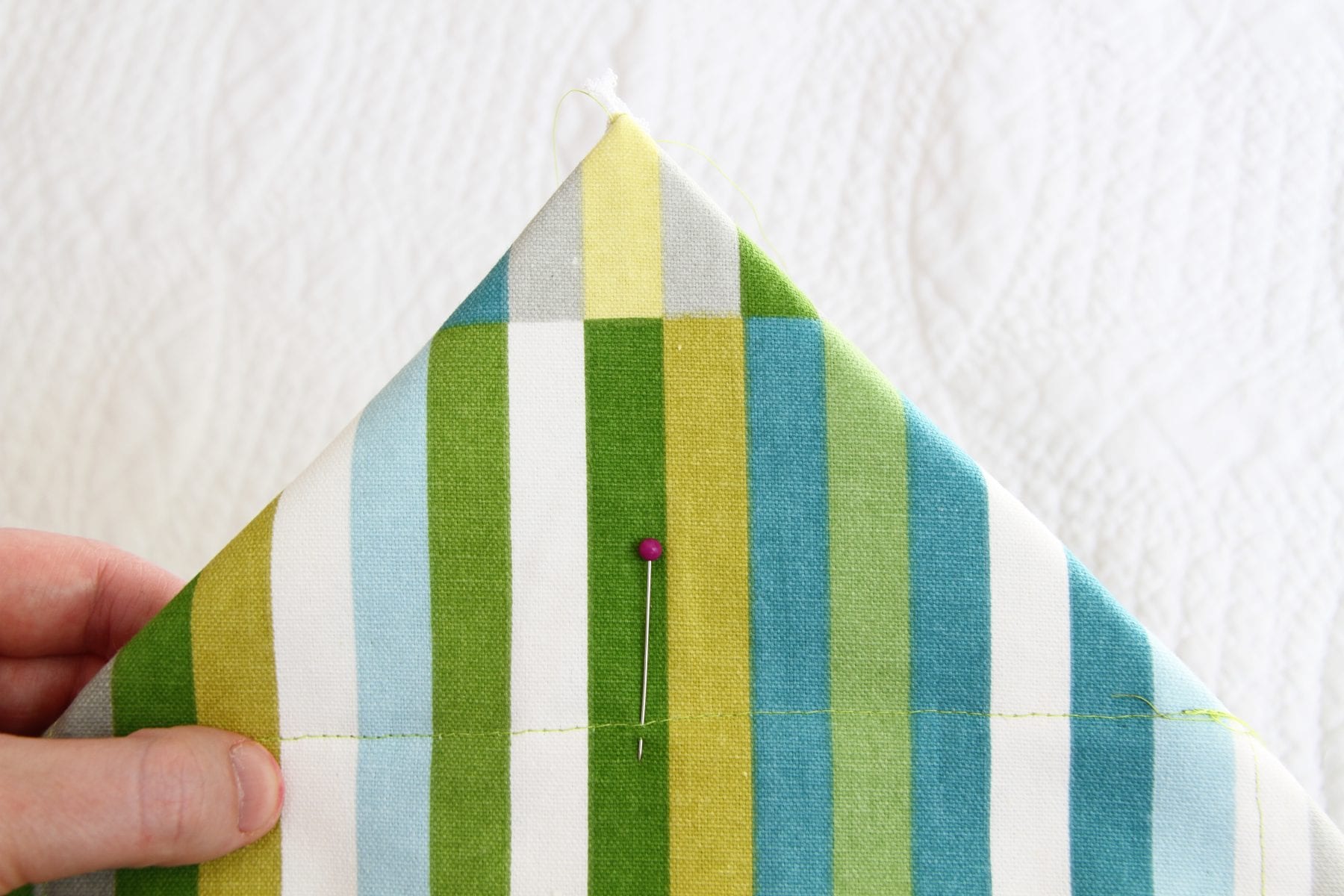 Then turn the fabric over on it’s side and make the tip nice and pointy while lining up the seam that’s now running along the top, even with the pin that you placed on the back side.  Just feel it with your fingers and line them up.