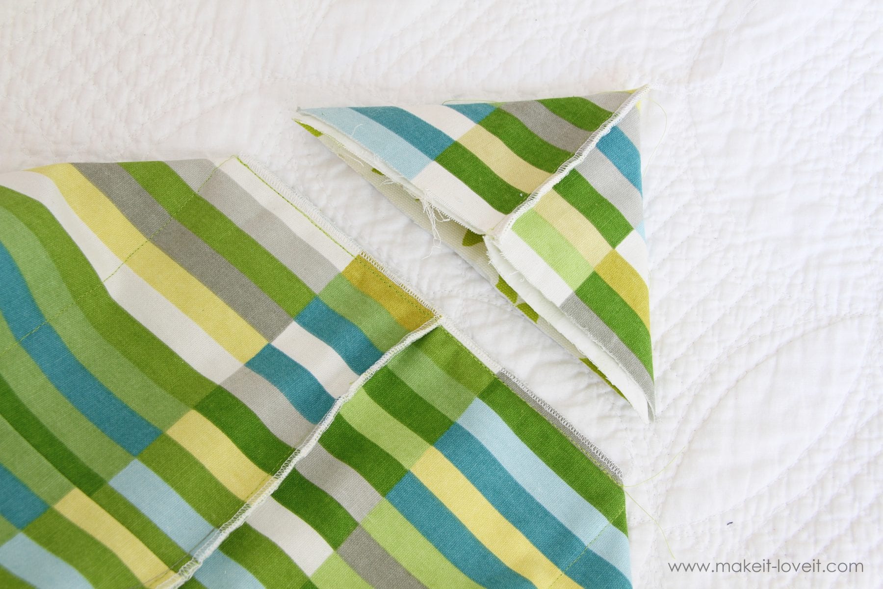 Now, look at the bottom corners. Place a pin right at the side where that seam (that is 4 3/4 inch from the bottom) hits the side.