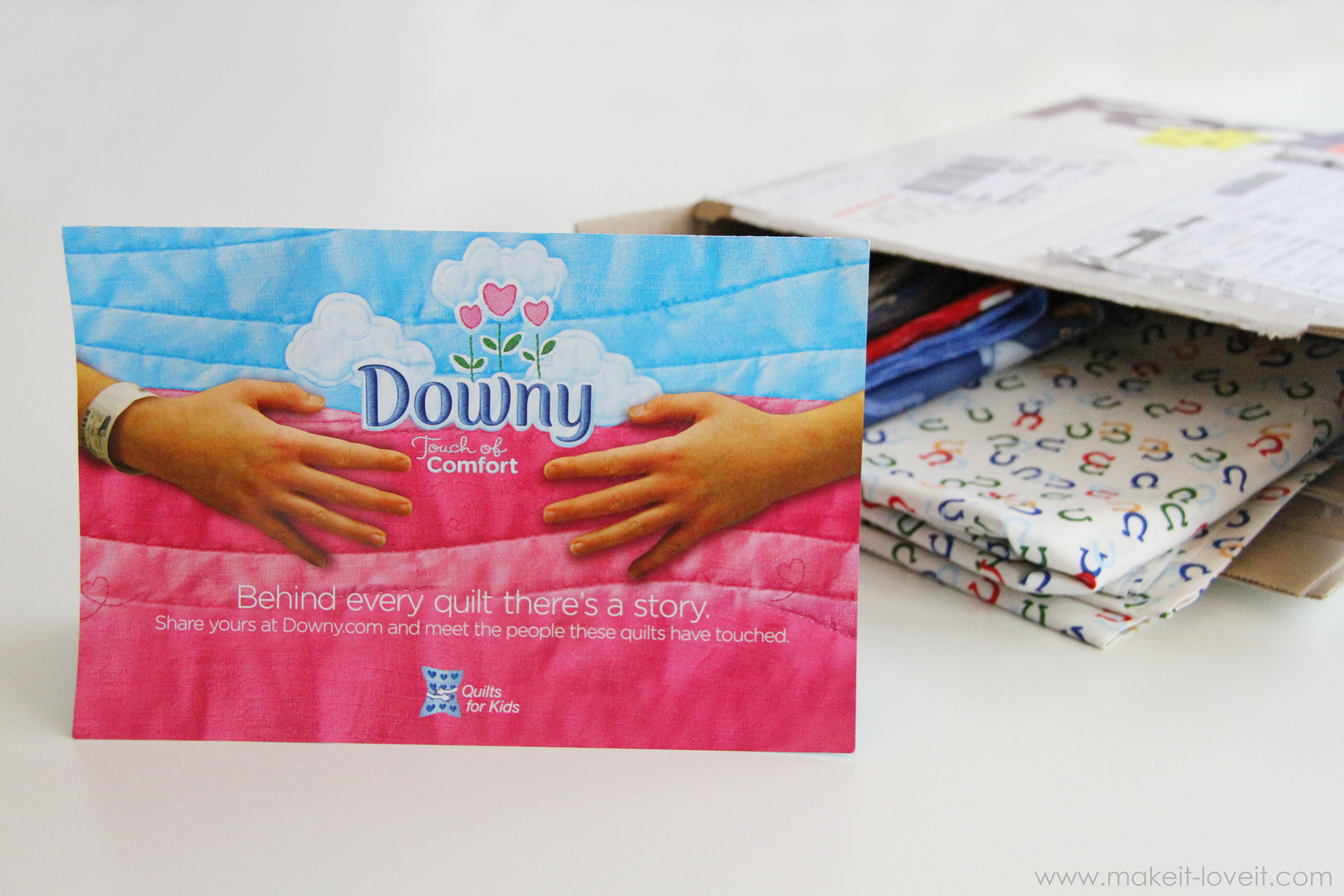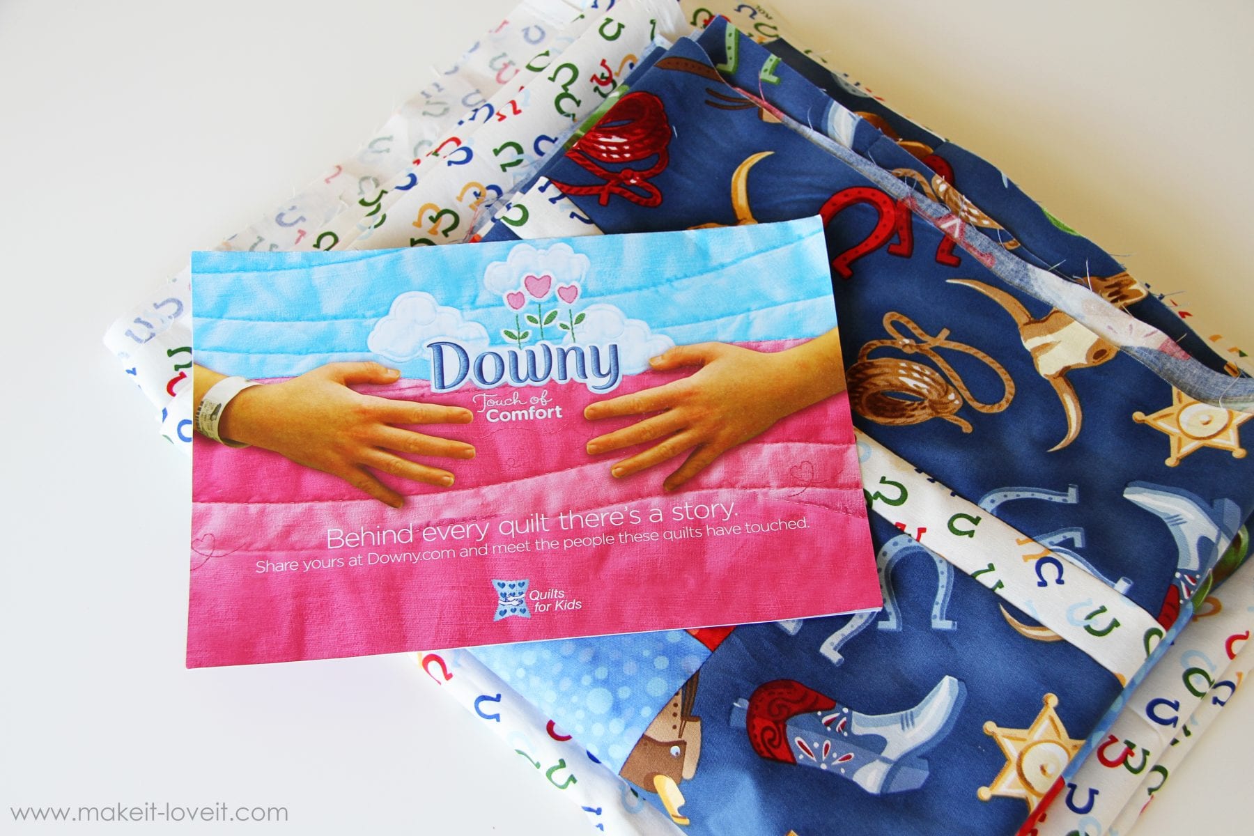 I was recently introduced to a really fantastic program. One that gathers and delivers vivid and beautiful handmade quilts to children in hospitals all over the country. I never realized this but children in hospitals often times are not allowed to bring personal items of comfort from home to stay with them. For this reason, the “Downy Touch of Comfort” campaign was born. They have partnered up with “Quilts for Kids” and have organized a way for children’s quilts (within certain specifications) to be gathered and donated to children who have been admitted to hospitals all over the U.S.Â