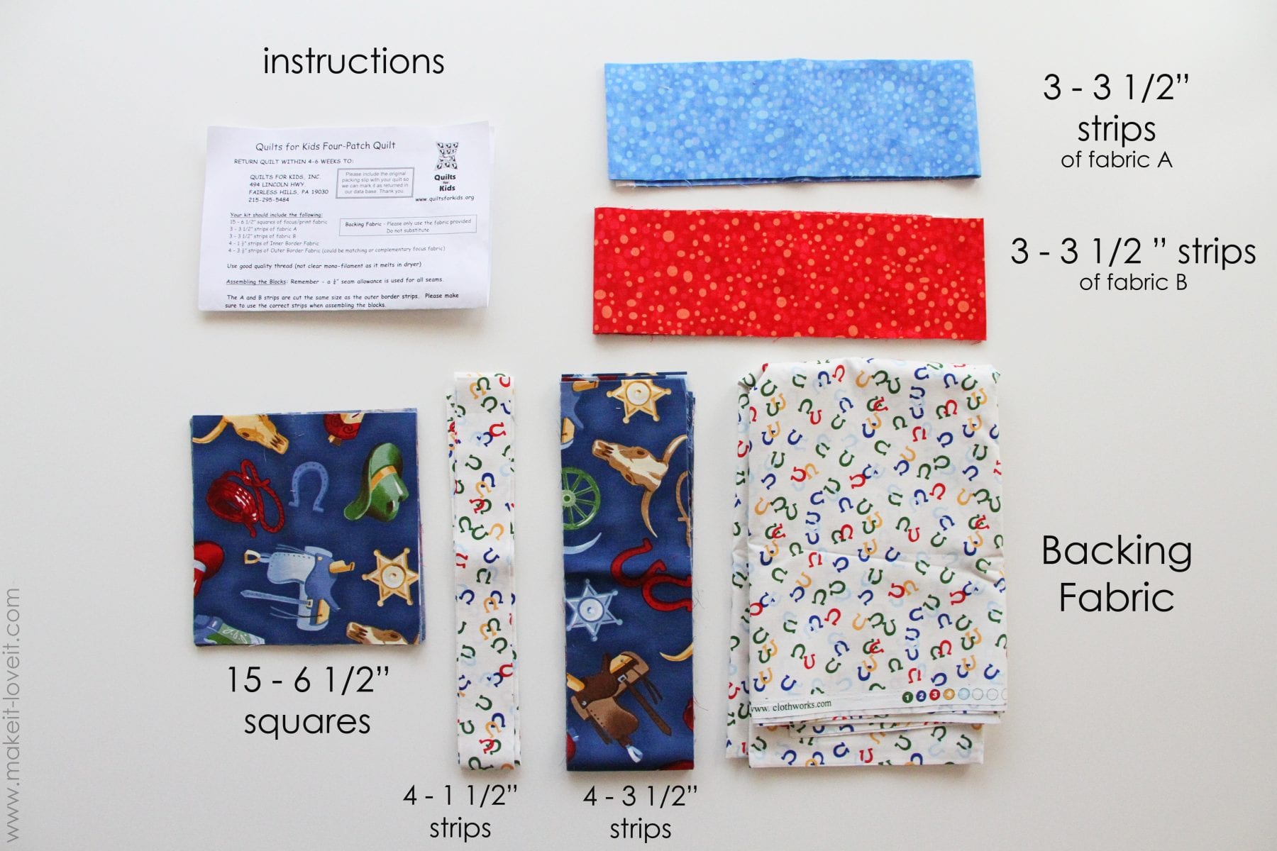 The quilt kits that are sent out, come with the fabric necessary to create a Four-Patch Quilt (that’s just the name of the pattern design). However, there are many more quilt patterns with instructions that are all suitable for this “Downy Touch of Comfort – Quilts for Kids” program, found here.