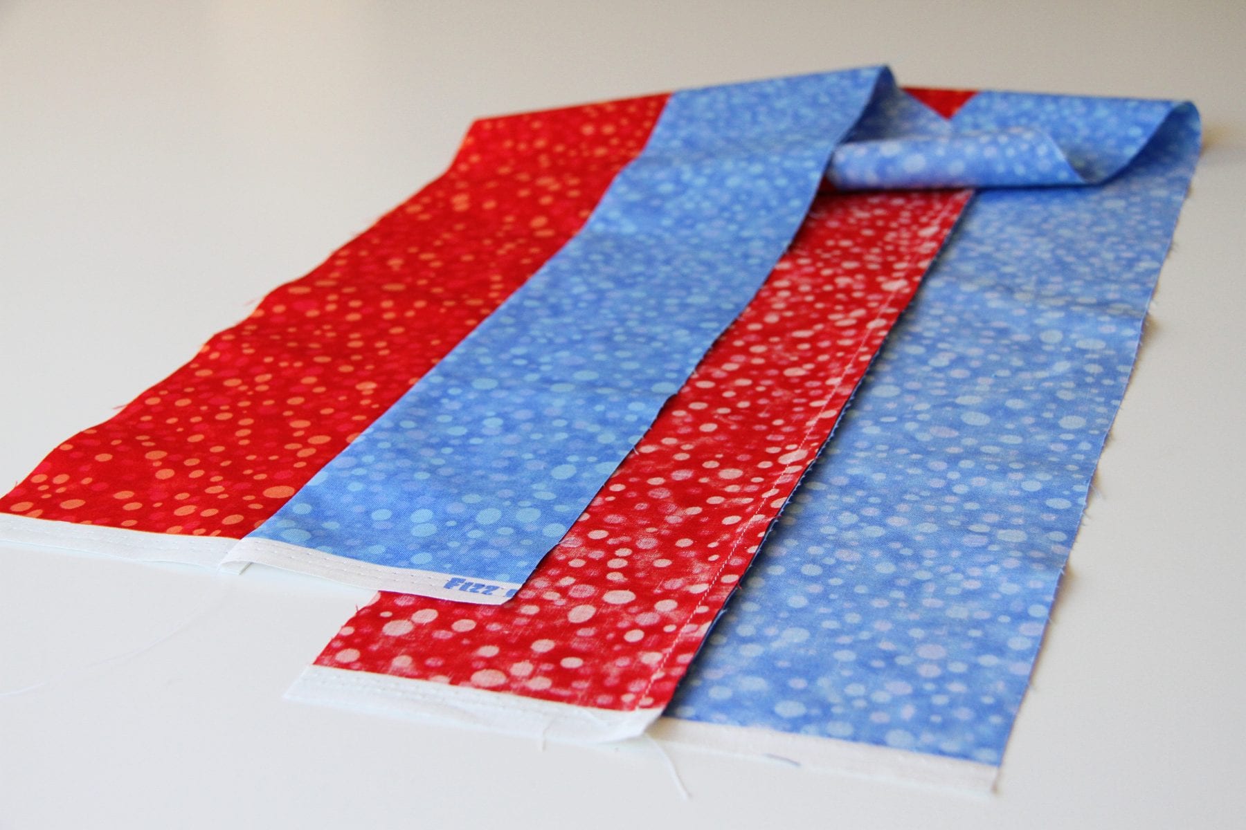 Then open it up and iron the seam to one side on the back. (I ironed it over to the blue side.) Then sew the other two Fabric A & B strips together and iron the seam in the back over to the same side as you did the first one. (You do this so that in a future step, the seam allowances lay opposite each other. It just helps eliminate some bulk.)