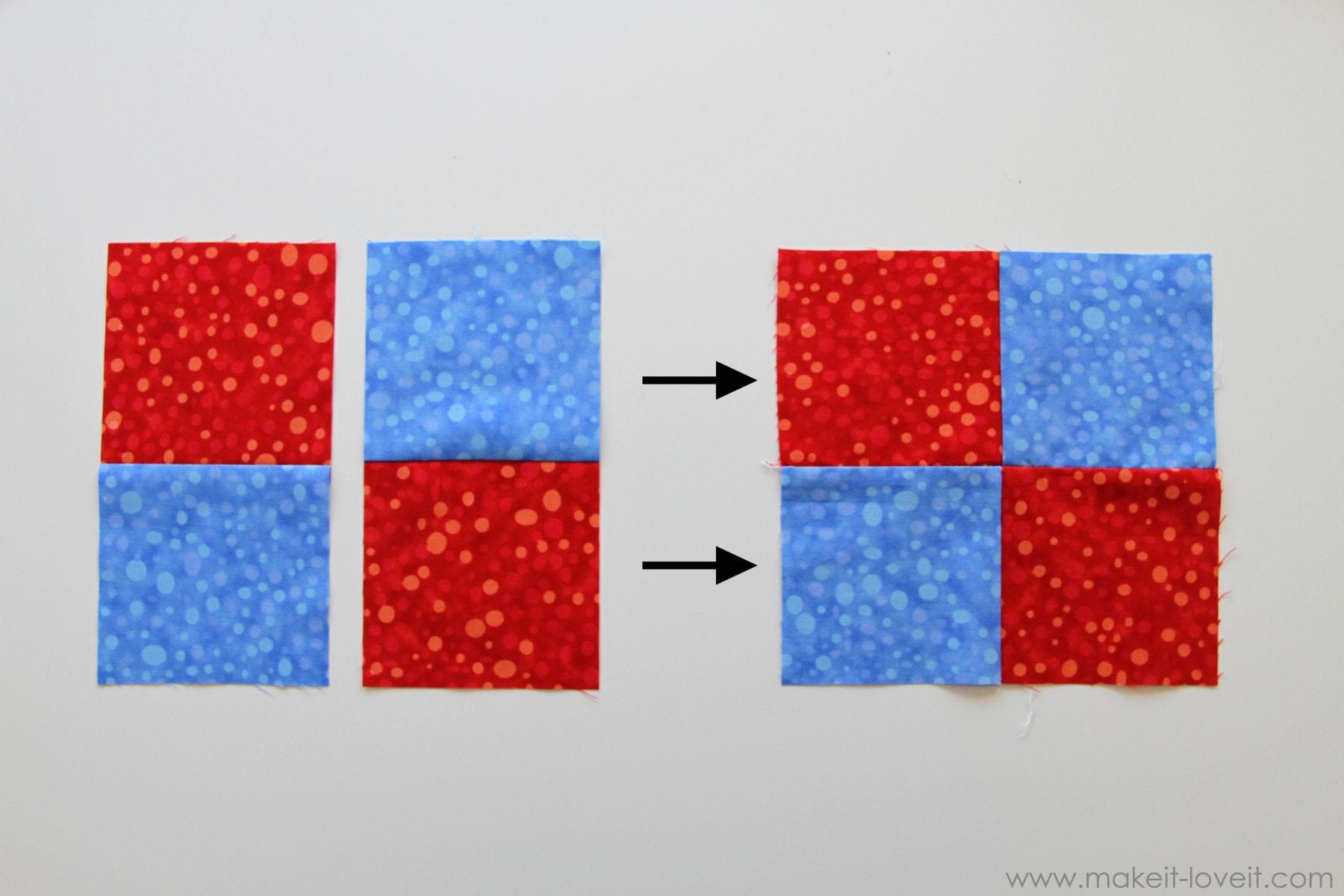 Then grab 2 of these little 3.5 inch sections and flip one around, to create a checkerboard look. Sew them together with right sides together.