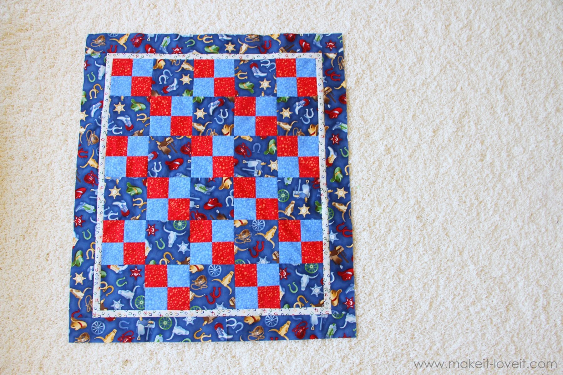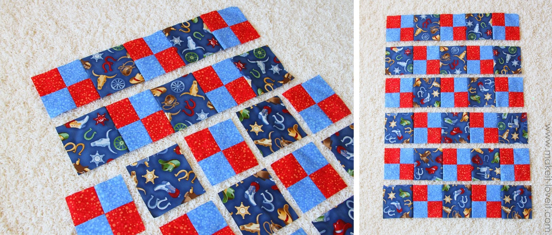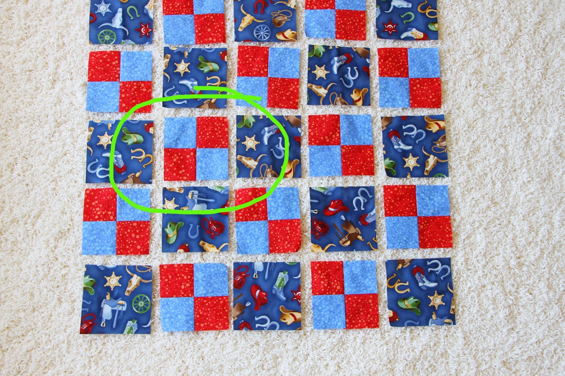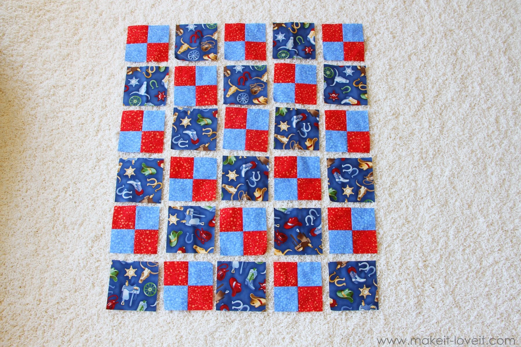 Then place them all down, alternating them with the plain fabric 6.5 inch squares, and lining them up just how you want your quilt to look.