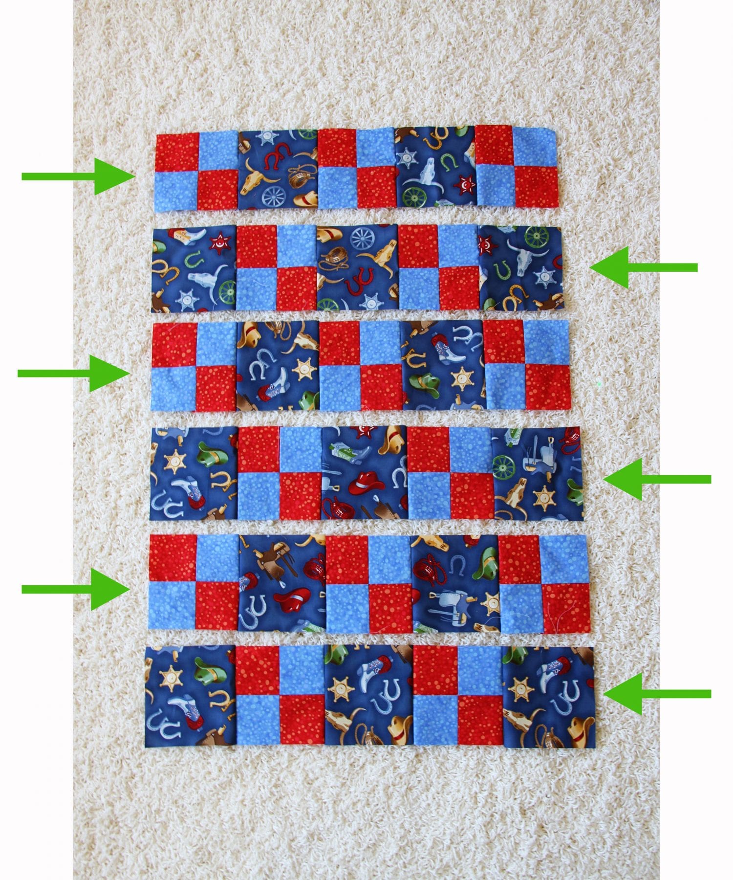 Then iron the down the seam allowances on the back of each strip, all facing to the right on the 1st, 3rd, and 5th rows. Then iron the seam allowances to the left on the 2nd, 4th, and 6th rows. That way, when you iron each row together, the seam allowances are facing different directions and will nest right up next to each other and won’t be so bulky when trying to sew. Now, sew each row together.