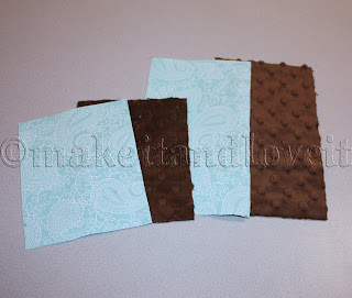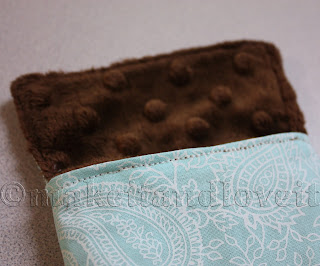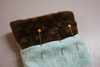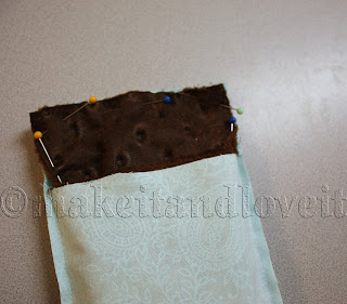 Cut out a front and a back piece out of the cotton and the minky. Measure how big you’ll need your front and back piece and then add a 1/4 inch to all sides for a seam allowance. Make the back piece about 2 inches longer so that it can flap over the front piece to close. I made my front piece 4.5 x 5.5 inches and my back piece 4.5 x 7.5 inches. So if you’re making a cozy for your Garmin GPS (standard…not widescreen), these dimensions should work great.