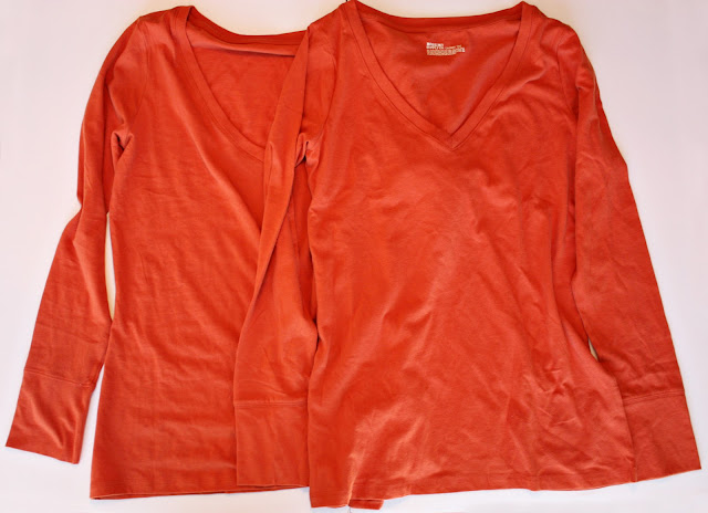 I purchased a long sleeved knit Tee that was a size bigger than I normally wear, to fit my growing belly, and also bought another one to use as the extra fabric. (Both were purchased on sale at Target and ended up still being cheaper than buying a new maternity shirt.)