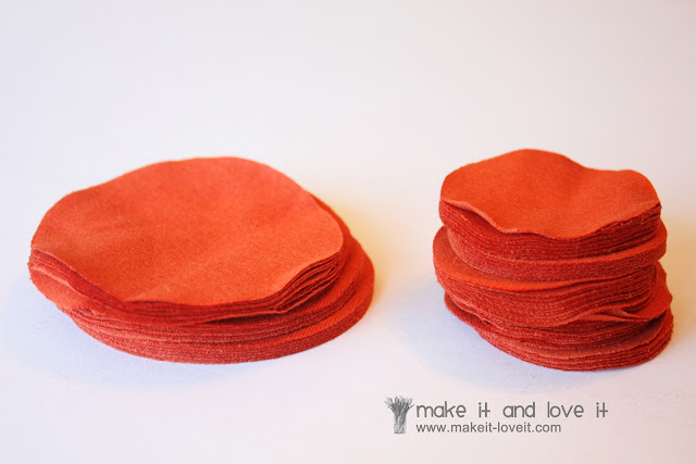 Then, begin cutting out 2 different sizes of circles out of the extra Tee. If you make it like mine, you’ll need 42 of the small circles (2 inches in diameter) and 18 large ones (3 inches in diameter).