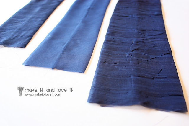 Fold each strip in half lengthwise and sew 1/4 inch from the edge. I used a narrow zig-zag stitch and then trimmed off the edge.