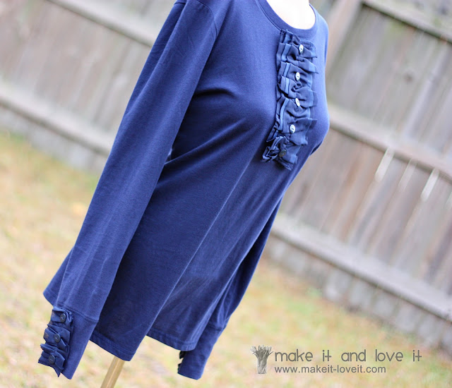 And then ruffled them up the same as above. I attached them to sides of the cuffs, opposite the inner seam of the sleeve. My shirt already had little cuffs on them that were were 4 inches long, so I used that as my guide for how long to make each ruffle. But you don’t have to have a cuff on your shirt to add this detail.