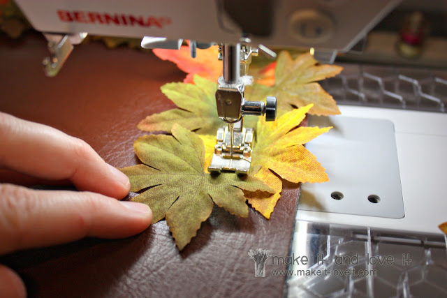 And then continue sewing right over the leaf, attaching it to the vinyl.