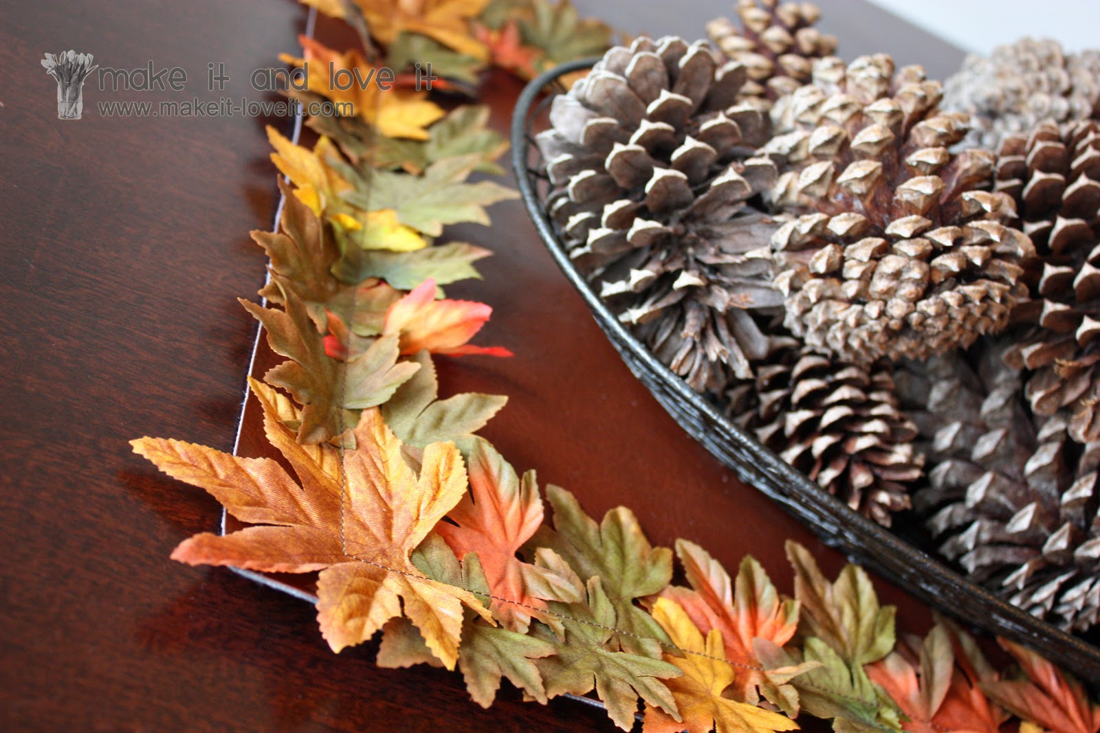 Then, grab some silk fall leaves (mine are from the dollar store) and get an idea of how you’d like to arrange them. Pin if you need to……..