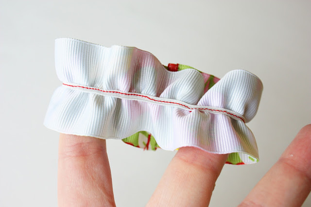 I took a strip of wide ribbon and sewed a piece of thin elastic onto the back. But while sewing, I stretched out the elastic as far as it would pull, continued sewing, and then once I let go of the elastic, it gathered the ribbon right in.