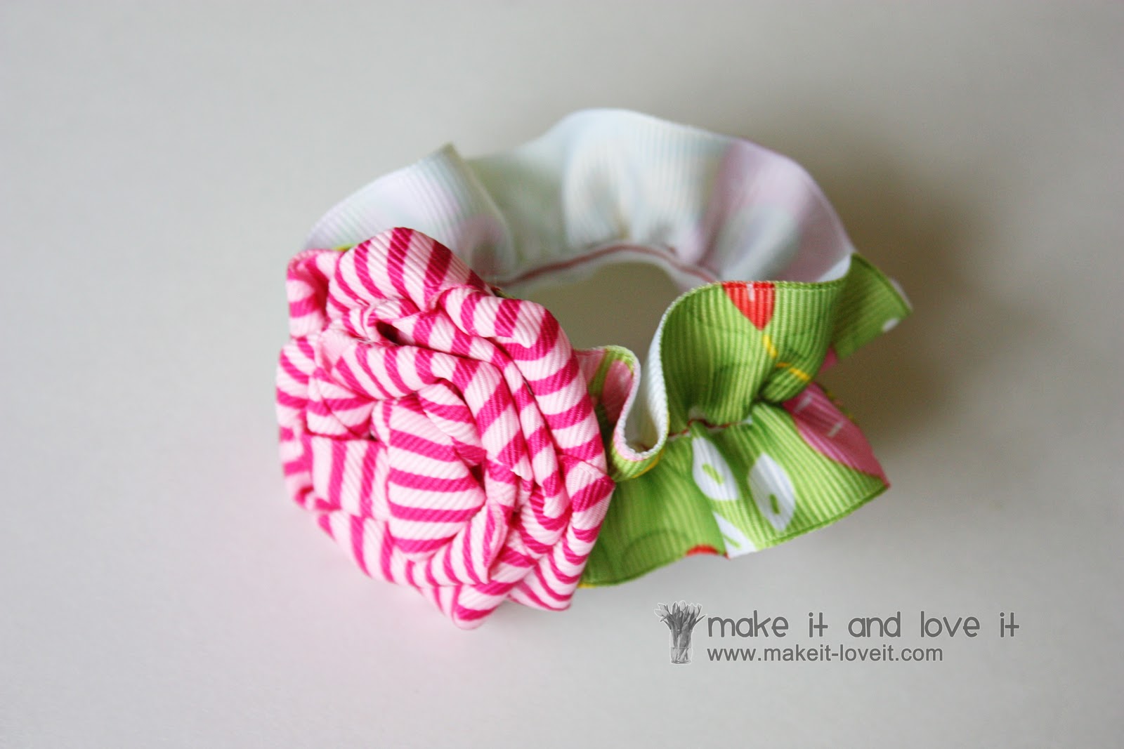 Then I sewed the 2 ends together and then sewed the loose ends down. Then I made a flower out of another color of ribbon (flower tutorial