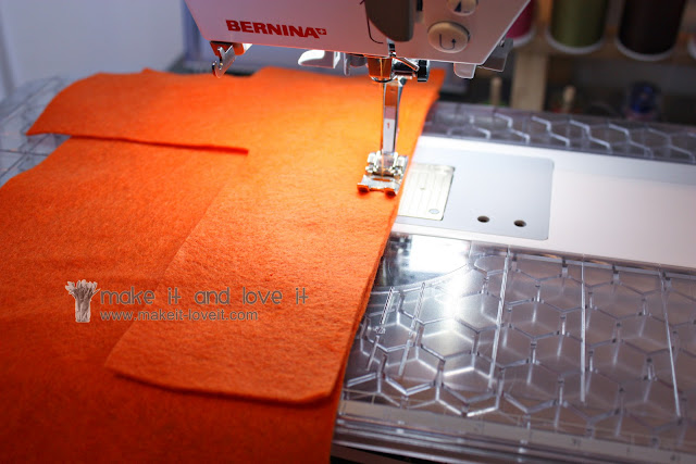 You’ll need to start by drawing out a basic side shape for your truck. Cut it out of paper and use it as a pattern to cut out 2 pieces of felt in whatever color you’d like. (I used all straight edges and and used a ruler to help me keep the edges even and precise.) Then, cut out a long strip that’s as wide as you’d like the width of the truck to be and long enough to go all the way down and around the center of the truck shape.