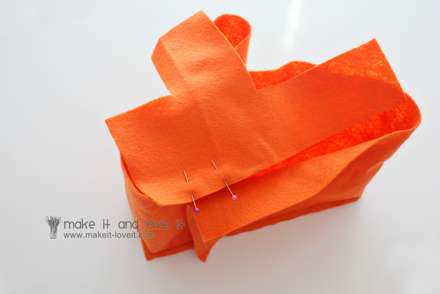 Then flip your truckover with the sewn edge facing down, and place your second truck shape on top. Pin the bottom edge where you’ll be starting your next seam, making sure to match up this side directly opposite the other side. If you don’t match this side up just how the other side is, your truck will turn out all funky and twisted.