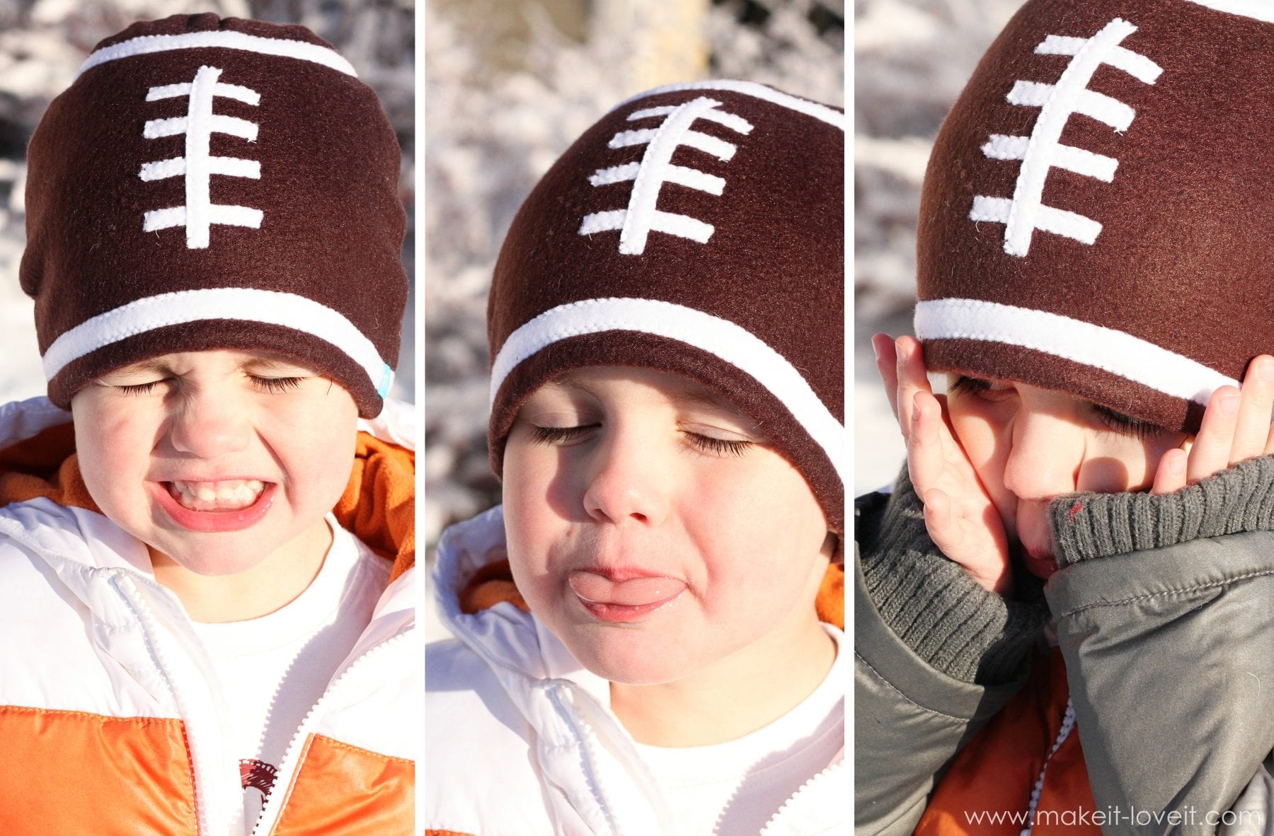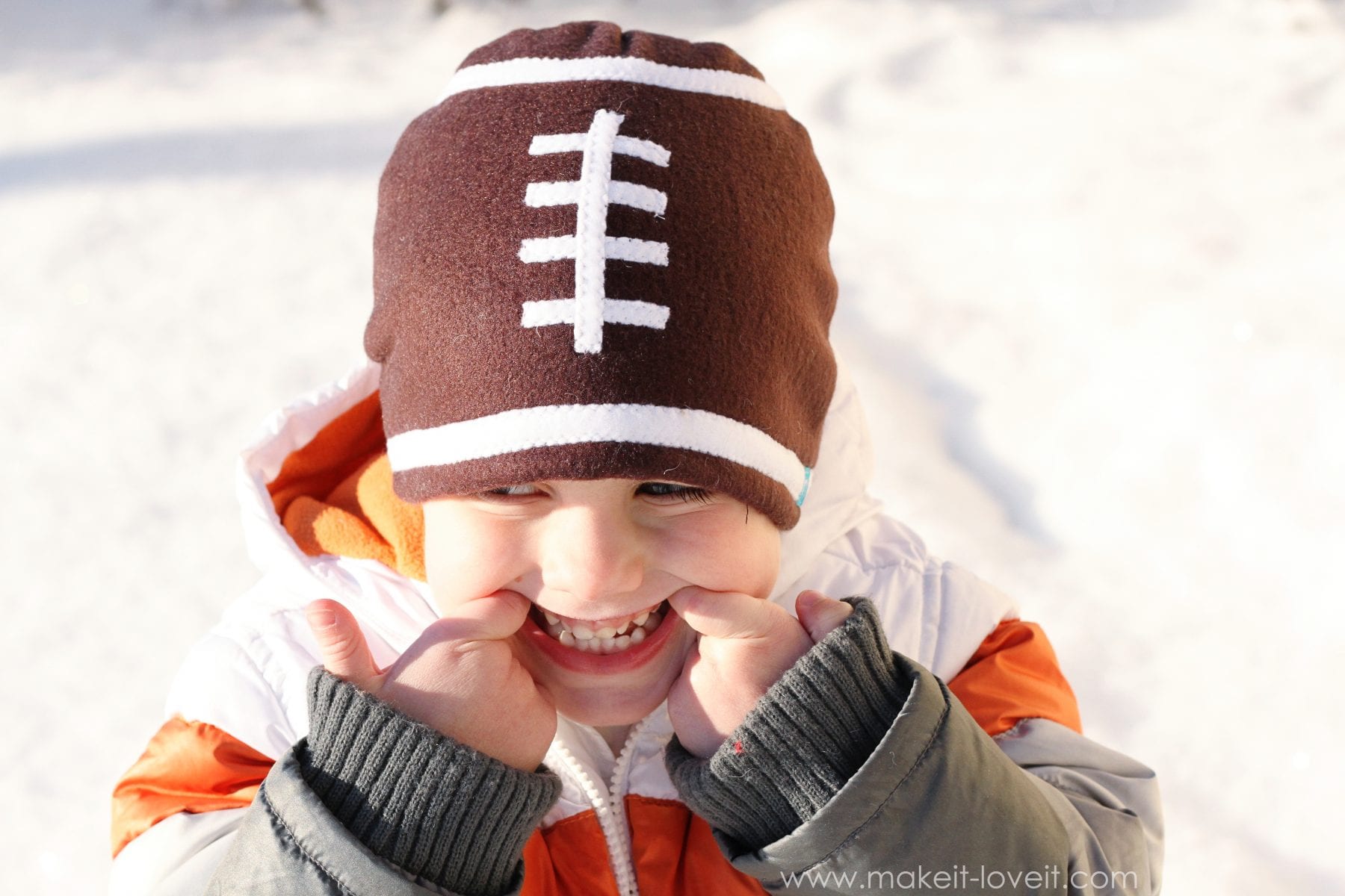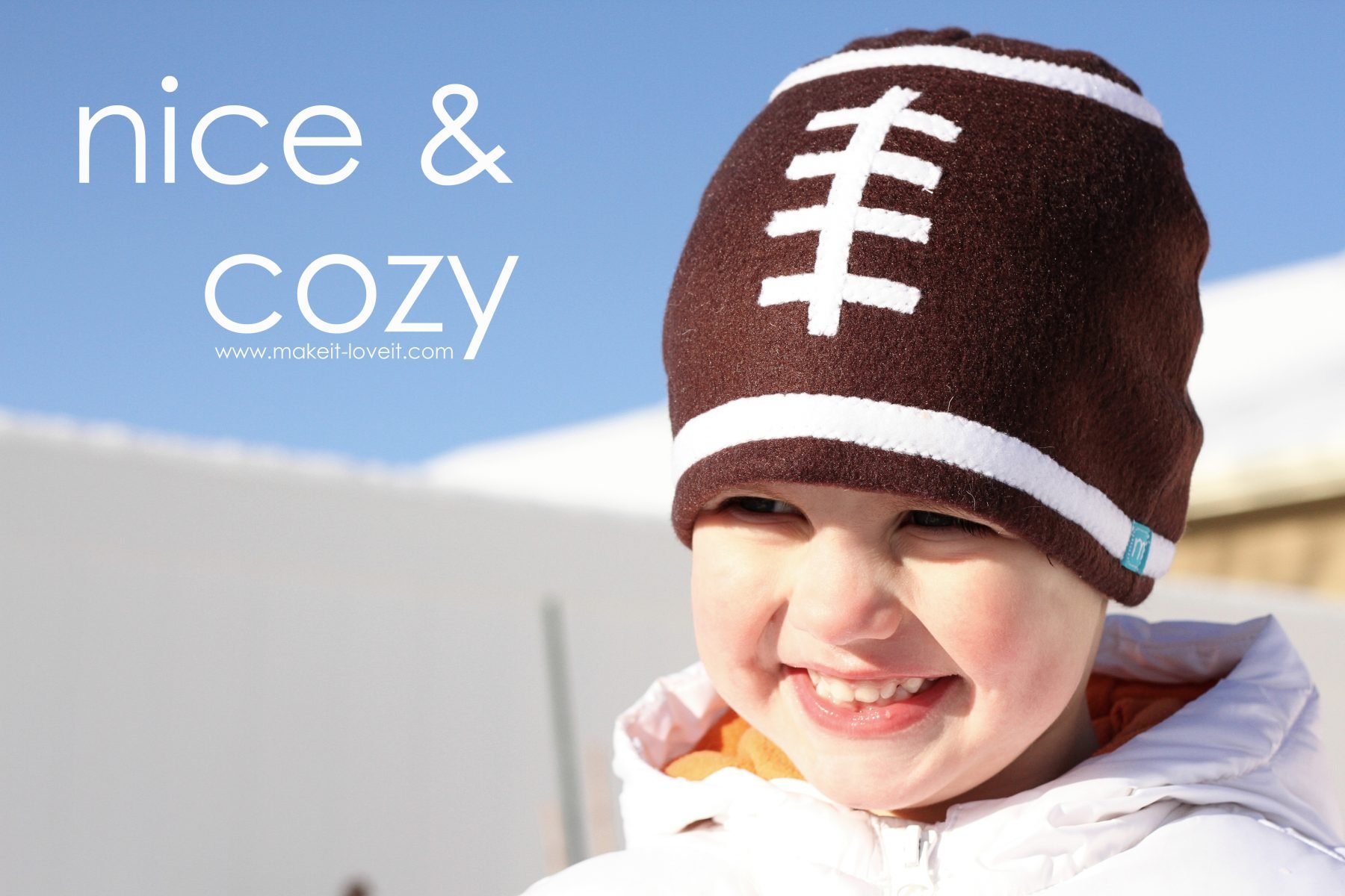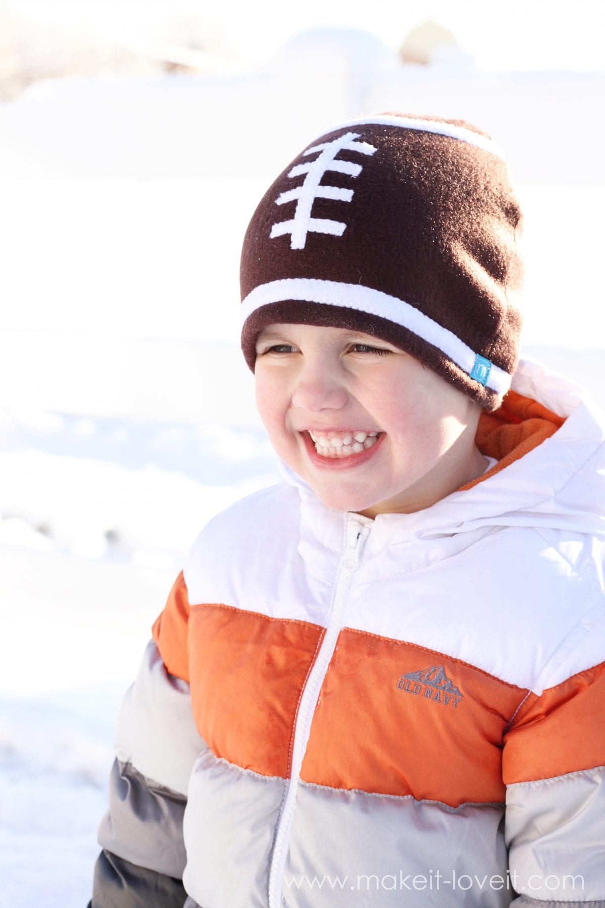 When I put his new hat on him this morning, he was ecstatic. And then asked me if I made him a football too……like the one he’s been seeing at the store and asks me to buy for him EVERY SINGLE TIME we see one. Sorry kiddo. (But I just may have to make one. Soon. ;) )