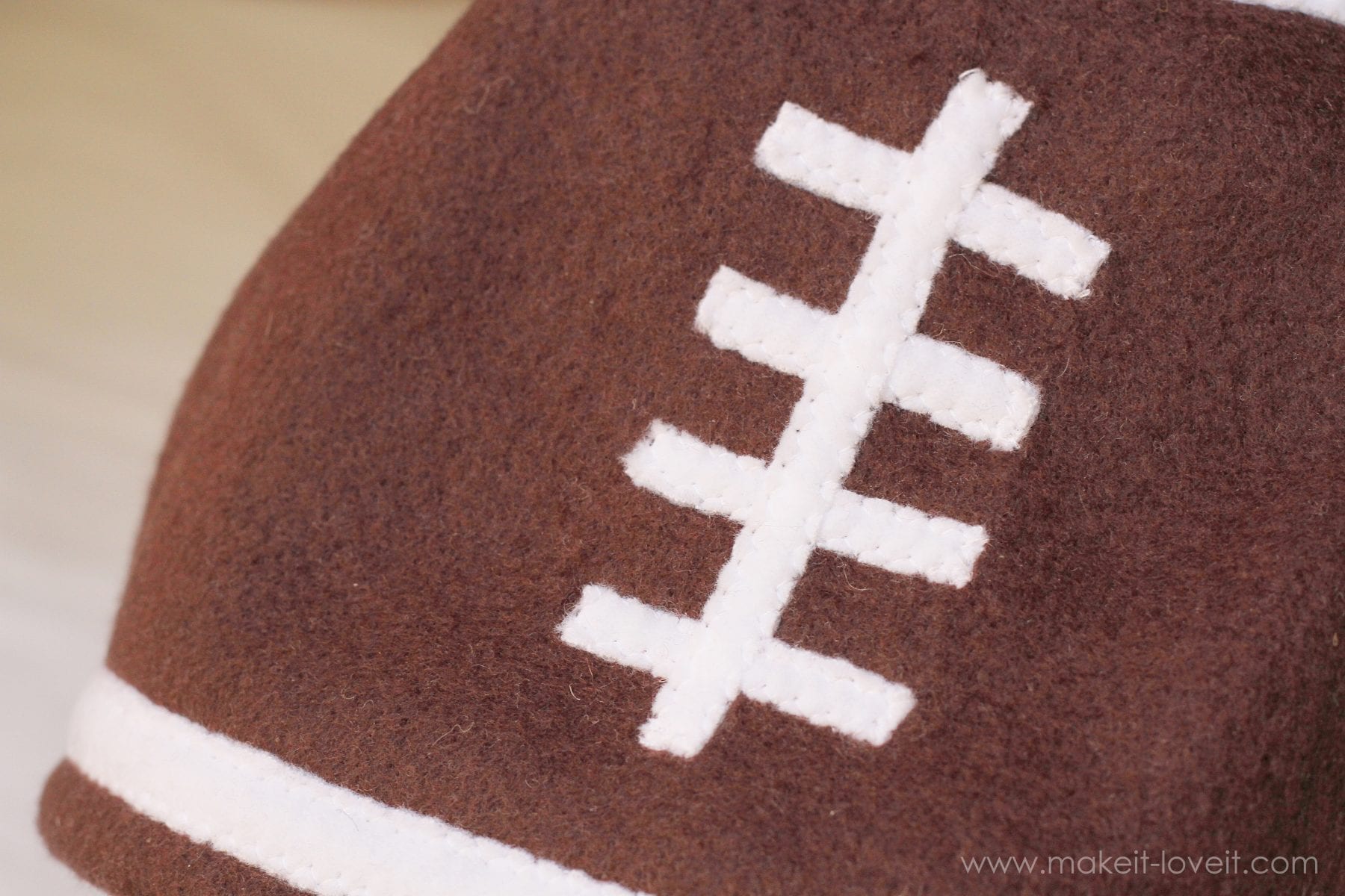 Sew the “white stitches” of the football the same way but make those strips just a bit more narrow. Make sure to center the “white stitching” along the center front of the hat. The number of horizontal strips will depend on the size of hat you’re making. I was able to fit 4 in there. Then sew the little horizontal strip on last.