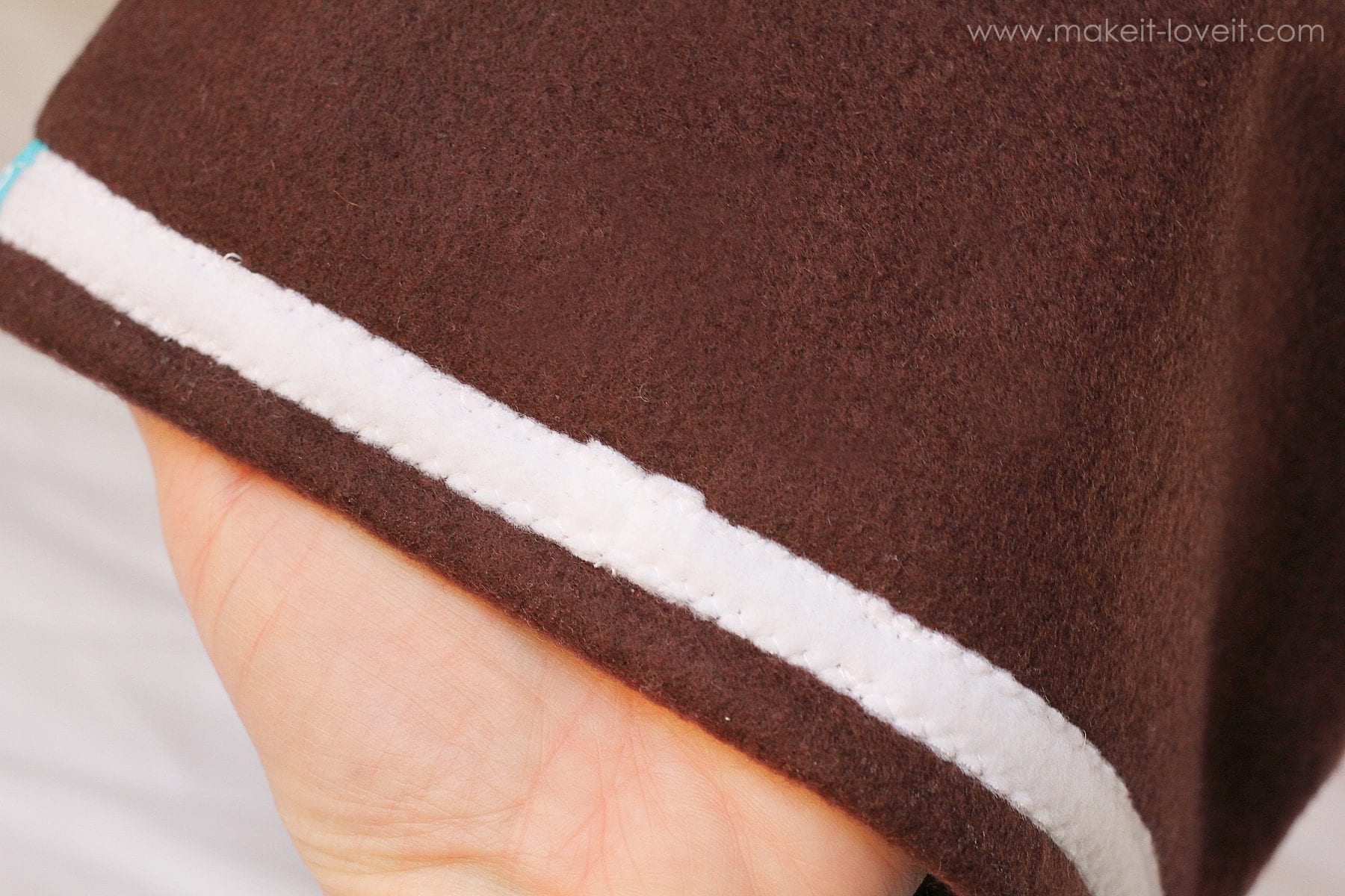 Sew the strip all the way around the hat and let the two ends meet in the back. Just sew one end right over the other or you can sew the strip into a circle before attaching to the hat. I know it’s kind of hard to see but there are zig-zags along both edges of the white strips.