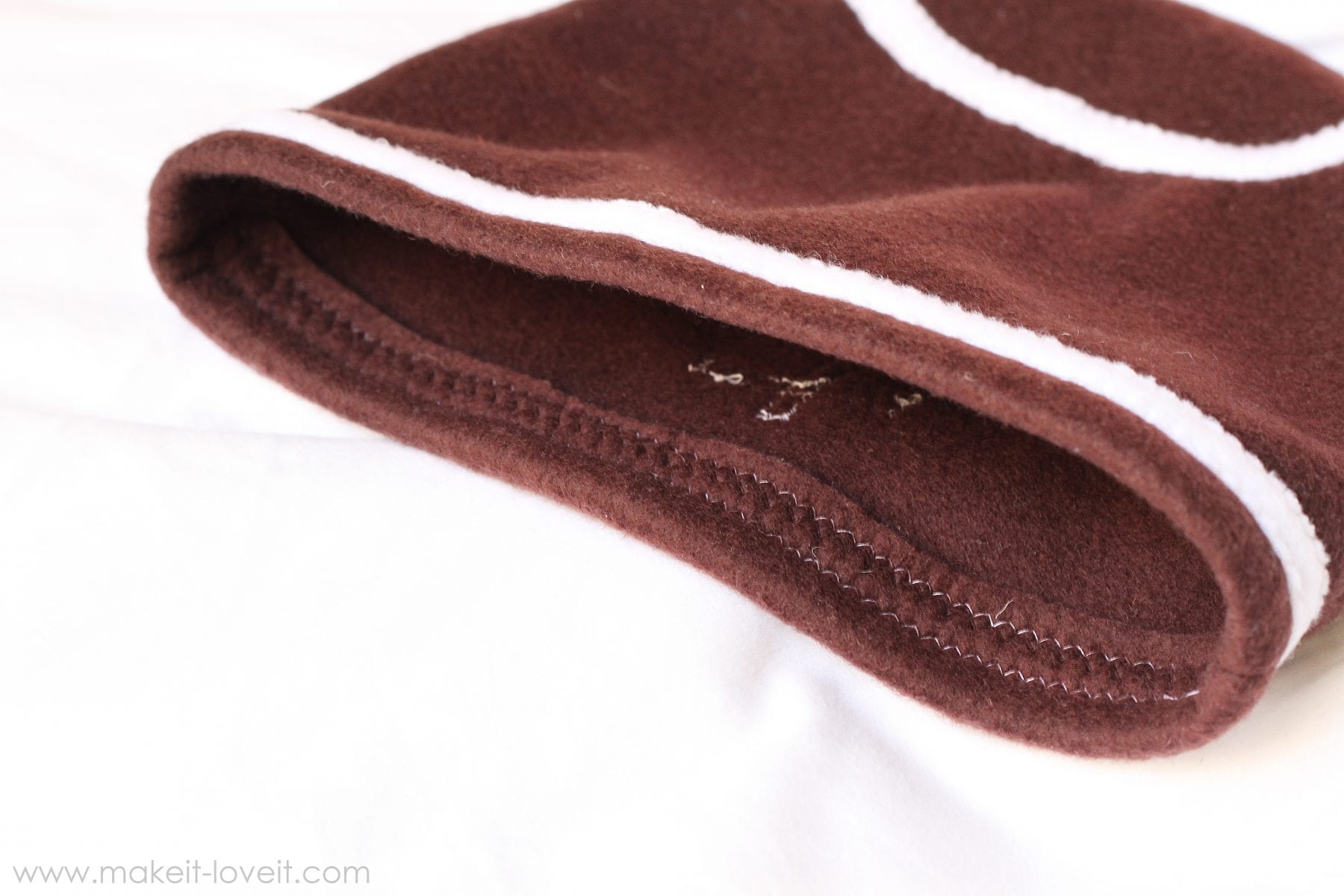 Then, cut narrow white strips (mine were about a 1/3 inch) of fleece to make the two white stripes on the football. (Be sure to cut them with the stretch going with the strip so that when you pull both ends of your strip, it stretches.) Now lay them down where you want them on the hat and pin them in place. I placed one about a 1/2 inch from the bottom of the hat and then another one a couple inches from the top. Since it’s a narrow (and kind of stretchy) strip, it’s pretty easy to curve the strip while still keeping it flat, so that it looks like the strips are more rounded (like a football) when on the head. Now, zig-zag along both edges of the strip (a straight stitch will keep the hat from stretching).Â