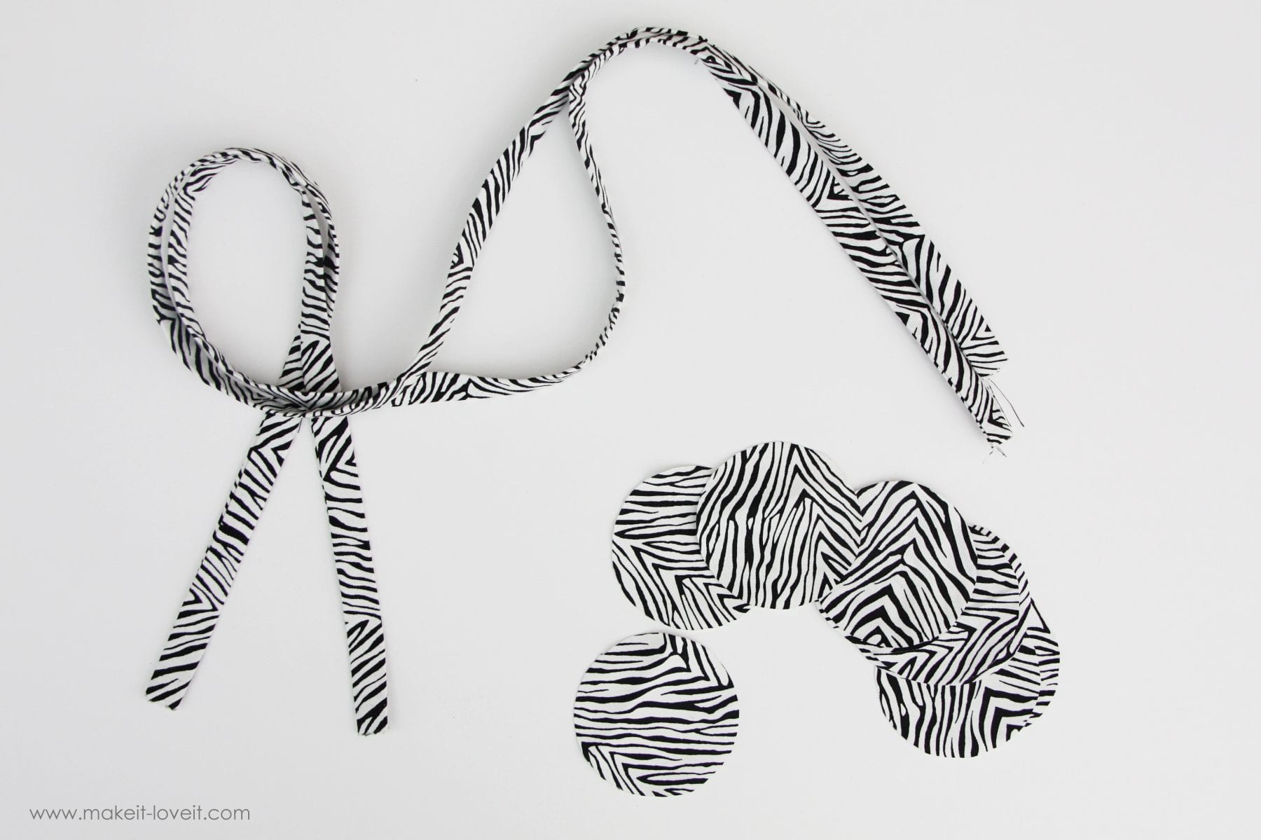 For this t-strap style, you’ll need 2 long strips of fabric and some circles. (I made 10 circles the size of one end of a can of vegetables…..but you can make them bigger or smaller. Go for it.)