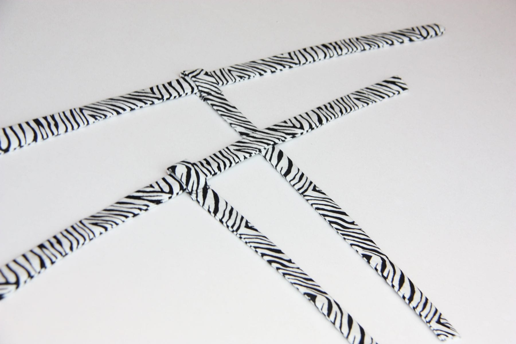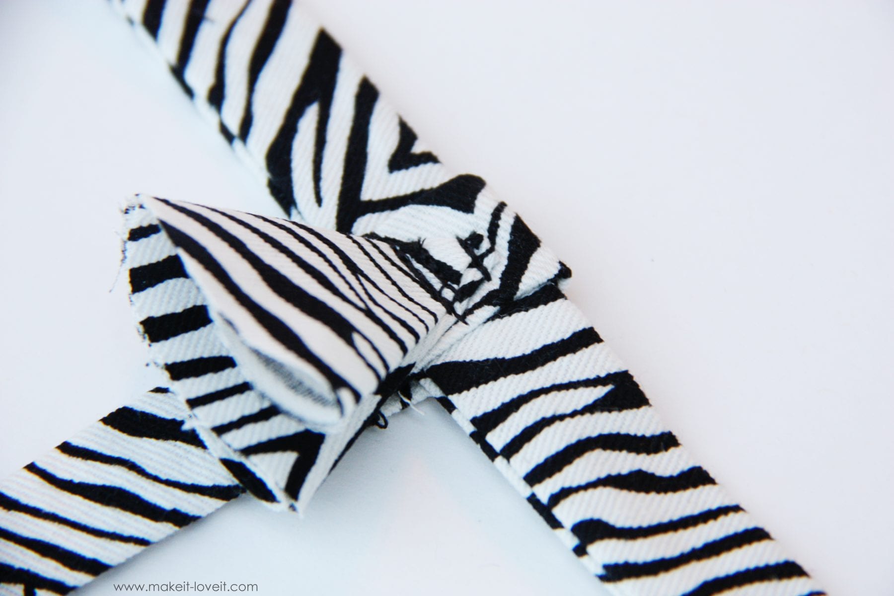 For the strips, I cut a 2 inch wide strips of fabric that were long enough to go across the top of the foot and then one down the center. I added several inches to the total length so that I would have plenty to tie knots with on the bottom side of the shoe. I created the 2 long strips by folding them in half lengthwise (with right sides together) and then sewed the 2 edges together with a 1/4 inch seam allowance. Then I turned them right side out and ironed them flat. (Need help turning right side out? Click here.)
