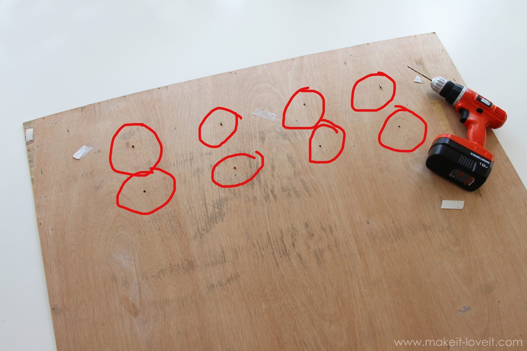 Then, I drilled 2 rows of 4 holes across (because after setting it at the head of my daughter’s twin bed, that’s about how much would show). You will have to measure and maybe make some temporary dots to see if that’s where you want your tufted buttons to go. Don’t skip the measuring, you don’t want it to look wonky. :)